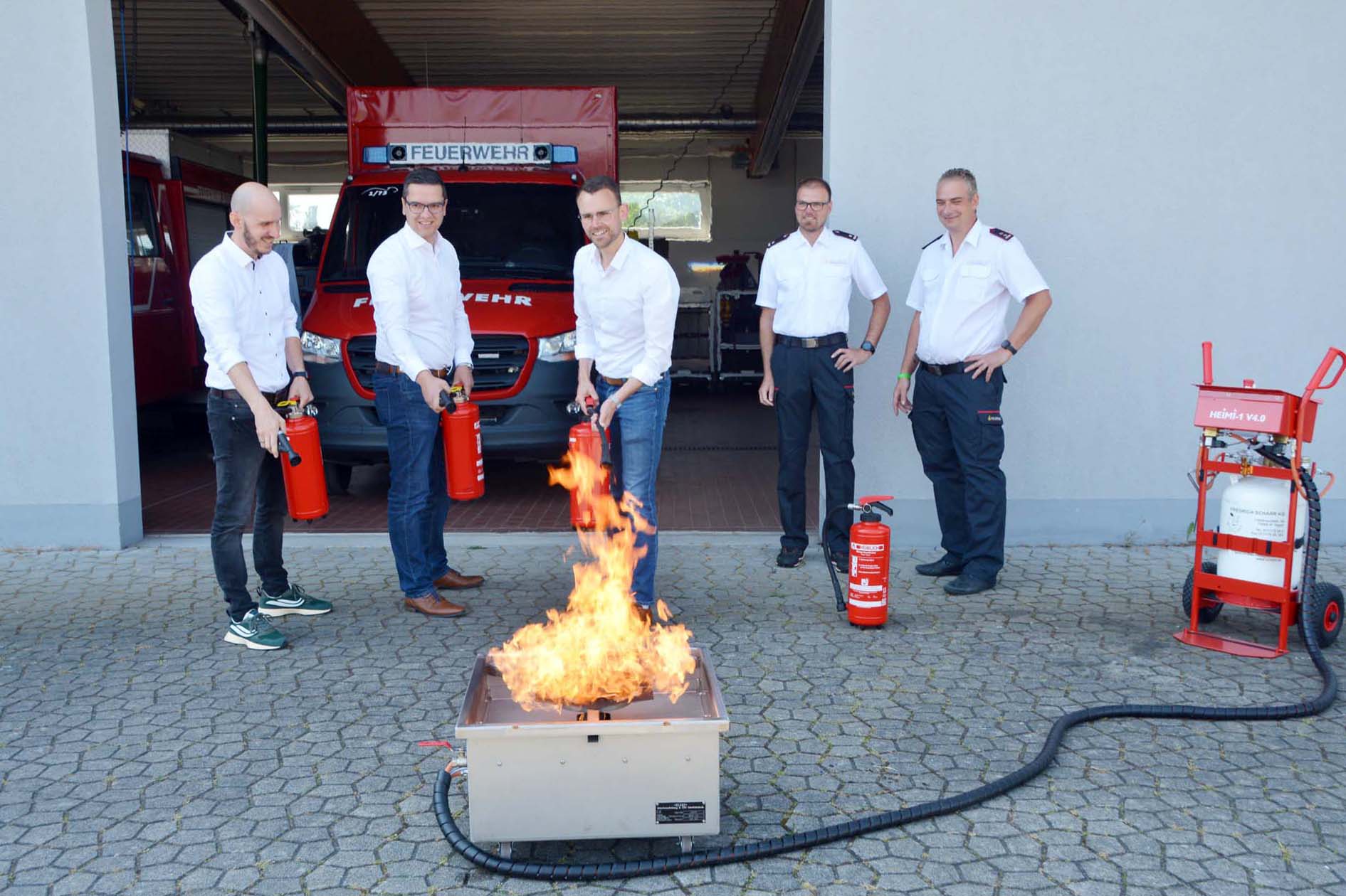 Erste gemeinsame Löschübung bei der Übergabe der gasbetriebenen Übungsanlage (von links): Nicki Eberle (Produktionsleiter Karl Knauer), Daniel Geiger (Personalleiter Hydro Systems), Bürgermeister Jonas Breig sowie die beiden stellv. Feuerwehrkommandanten Jochen Cunico und Florian Möller. Foto: Hanspeter Schendemann
