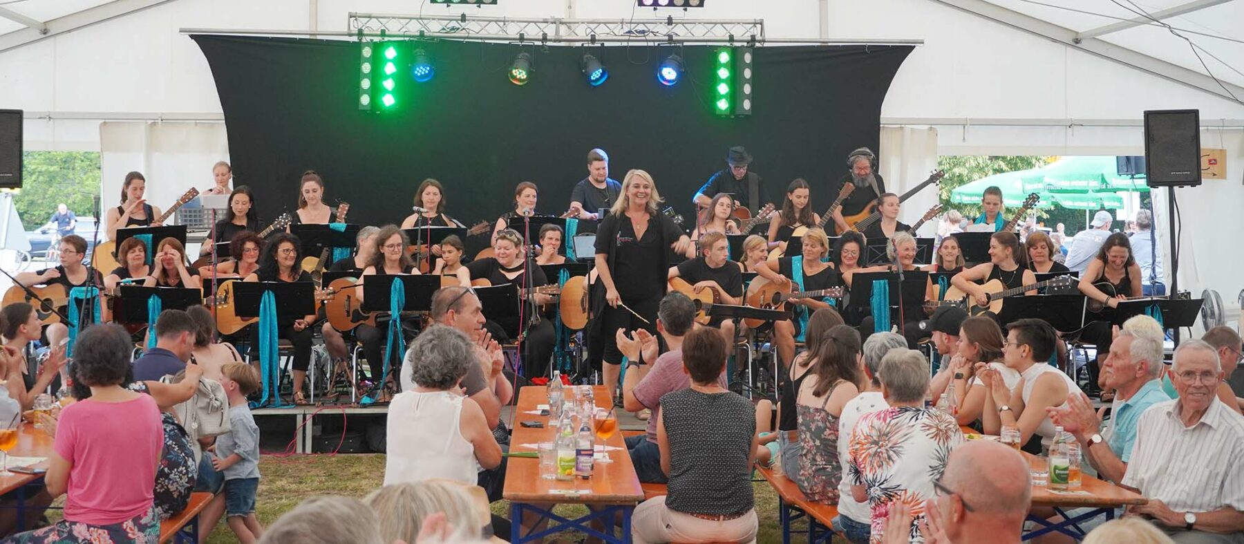 Anders als gewohnt ging es auch am Montag weiter. Statt traditionell eines Blasorchesters spielte der Gitarrenverein aus Nordrach. Die rund 40 aktiven Musikerinnen und Musiker steckten die zahlreichen Festbesucher am Montag im Handumdrehen von ihrer Begeisterung für Musik an.
