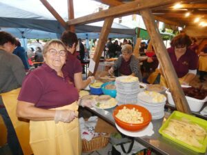 Um 15 Uhr schon hatte man mit dem Aufbau begonnen, „pünktlich um 18 Uhr fing es dann an zu schütten.“ Und doch strahlten die Verantwortlichen. „Wir finden es toll, dass trotzdem so viele Leute mit ihren Regenschirmen gekommen sind“, meinten die Landfrauen mit Blick auf das vom Himmel platschende Nass.