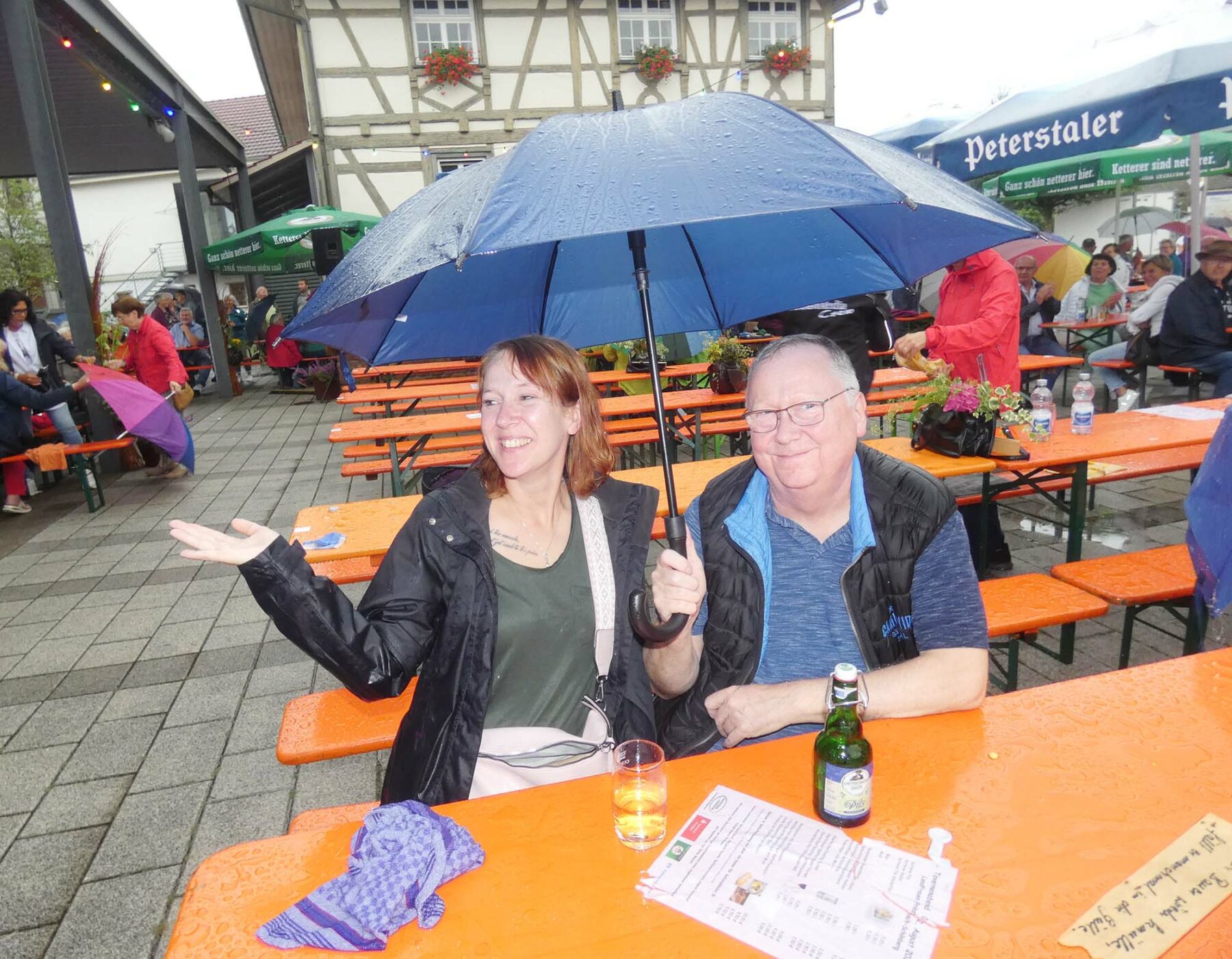 Sämtliche fest überdachten Plätze waren besetzt. Und dort, wo große Sonnenschirme über Tische und Bänke gespannt waren, hatten sich zum zusätzlichen Schutz vor dem aus allen Wolken und teils von allen Seiten kommenden Nass bunte Regenschirmburgen gebildet. Regenjacken taten ihr Übriges.
