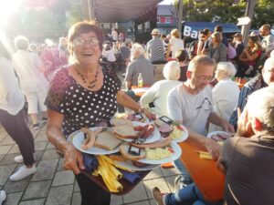 Im Winter bereits hatte es die ersten Gespräche mit der Gemeinde gegeben. Ab Juni dann traf sich der Vereinsvorstand fünfmal, um die großen Ereignisse zu planen und zu organisieren. Tanzende, singende und im Takt der Musik in langen Sitzreihen schunkelnde Menschen dankten es – altgediente Schlager wie „Ro-ro-rot sind ro-te Ro-sen“ waren hierfür Steilvorlagen, von der Ortenauer Kultband „Die Ramonas“ zum Besten gegeben.