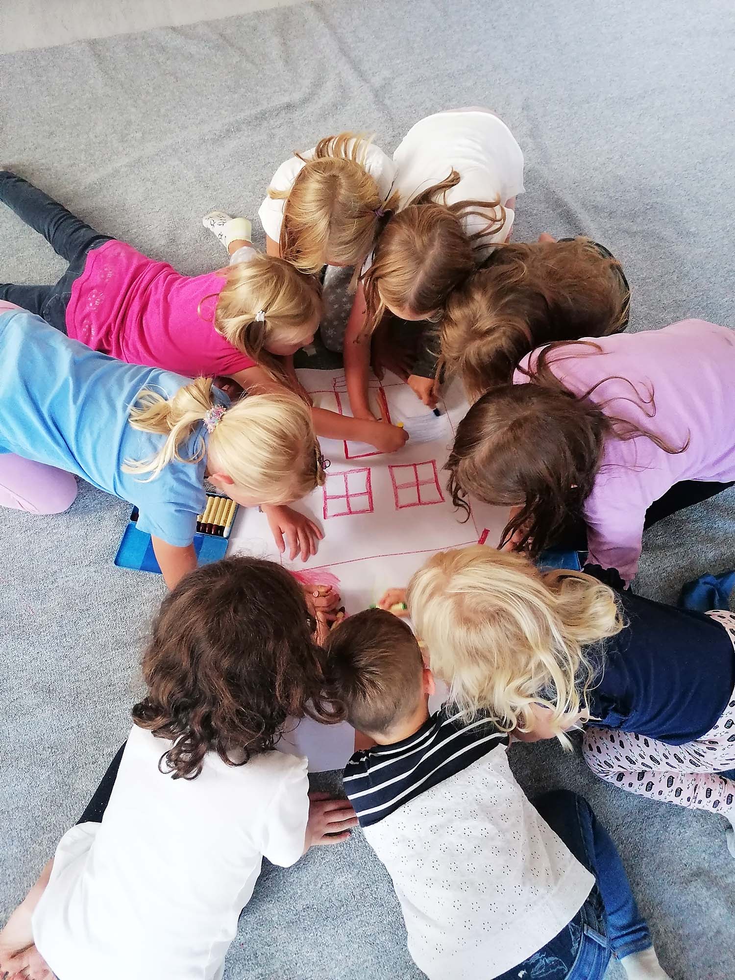 Der Einsiedlerkrebs Herbert sucht in der gleichnamigen Geschichte von Eric Carle ein neues Haus und dekoriert es mit den Schätzen des Meeres. Auch er überlässt sein Traumhaus am Ende einem anderen, da es eine Nummer zu klein geworden ist für ihn. Auch die Kindergruppe malte gemeinsam ein buntes Bild, das ein Traumhaus zeigte.