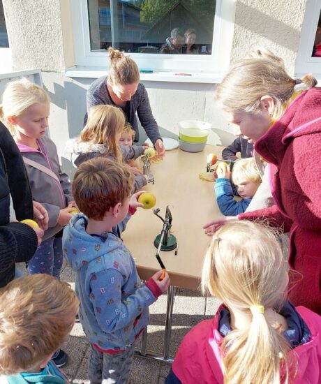 Zu guter Letzt durften die Kinder draußen nachsehen, was aus dem vor über anderthalb Jahren von ihnen gepflanzten Apfelbaum geworden ist: Zur Überraschung aller hing ein kleines, rotes angepicktes Äpfelchen an den Ästen des Bäumchens und unterm Baum wartete ein Korb voller Äpfel auf die Kinder. In echter Handarbeit durften die Kinder die Äpfel in Apfelschälmaschinen einspannen und durch Kurbeln aufschneiden. So hatte tatsächlich jedes Kind Lust auf einen frischen Apfel und konnte sich gestärkt auf den Heimweg machen.
