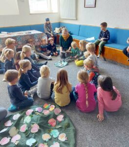 Anschließend hörten alle die Geschichte von „Hänschen Apfelkern“. Er sammelte Apfelkerne und streute sie als Dank auf den verschiedenen Stationen seiner Reise wieder aus. Und aus den Apfelkernen wuchsen über die Jahre hinweg tatsächlich Obstgärtchen. Nach seiner Rückkehr bekam der große Hans einen Apfel aus dem Obstgarten geschenkt. Und nachdem die Kinder Hänschens Wirken gespannt verfolgt hatten, durften sie im Anschluss aktiv werden und bei einer Mitmach-Geschichte rund um den Apfelbaum pantomimisch Äpfel pflücken.