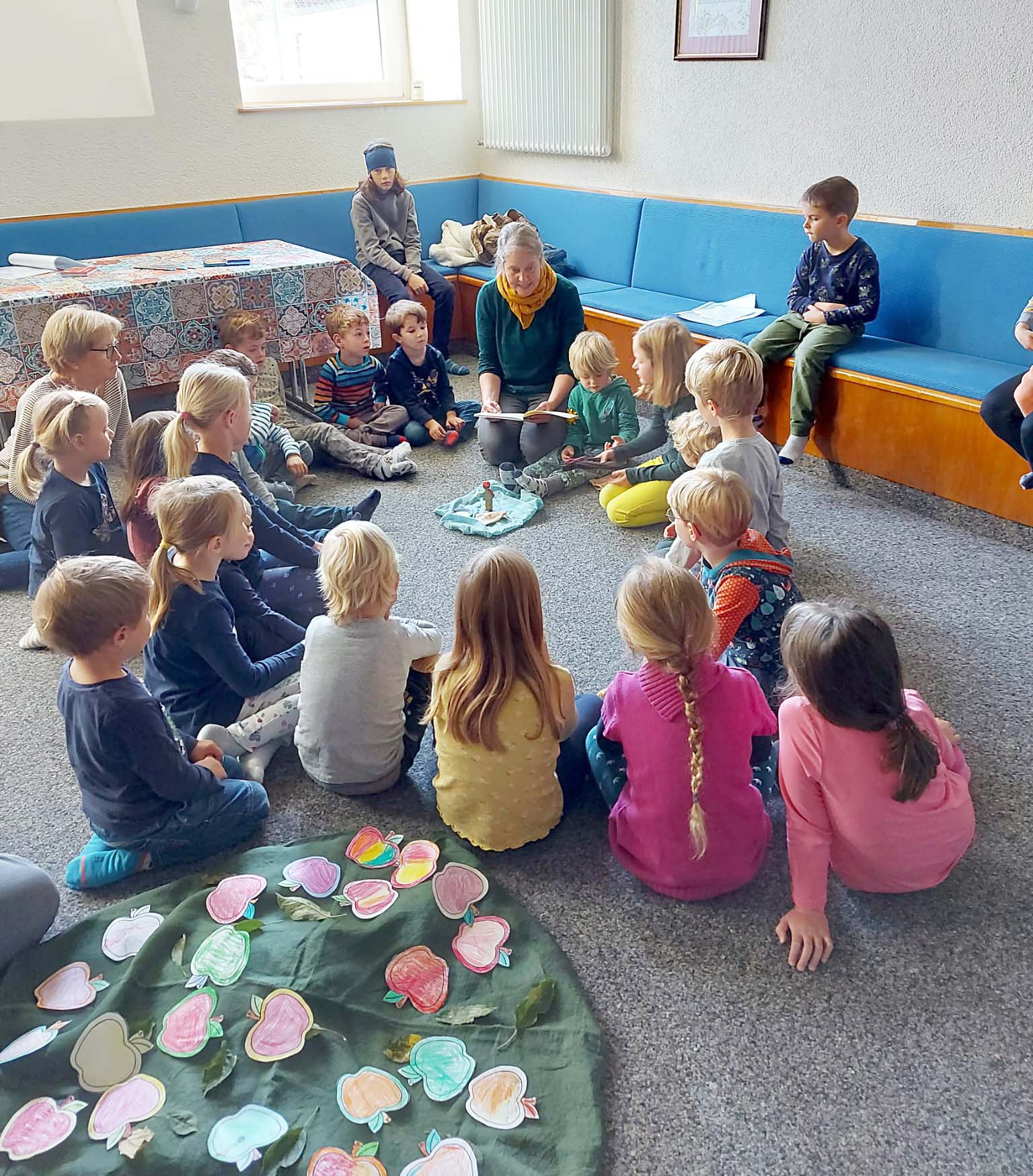 Es versammelten sich rund 25 Kinder im Chorsaal, um gemeinsam einen Gottesdienst in der Kinderkirche zu feiern. Zu Beginn stimmten sich alle mit einem Bewegungslied ein. In der Mitte gab es einen aus Tüchern gelegten Apfelbaum zu betrachten. Die Kinder überlegten gemeinsam mit den Erwachsenen, wofür sie dankbar sind, und bemalten hierzu Äpfelchen aus Papier, die dem Baum Farbe verliehen und die Dankbarkeit sichtbar machten.