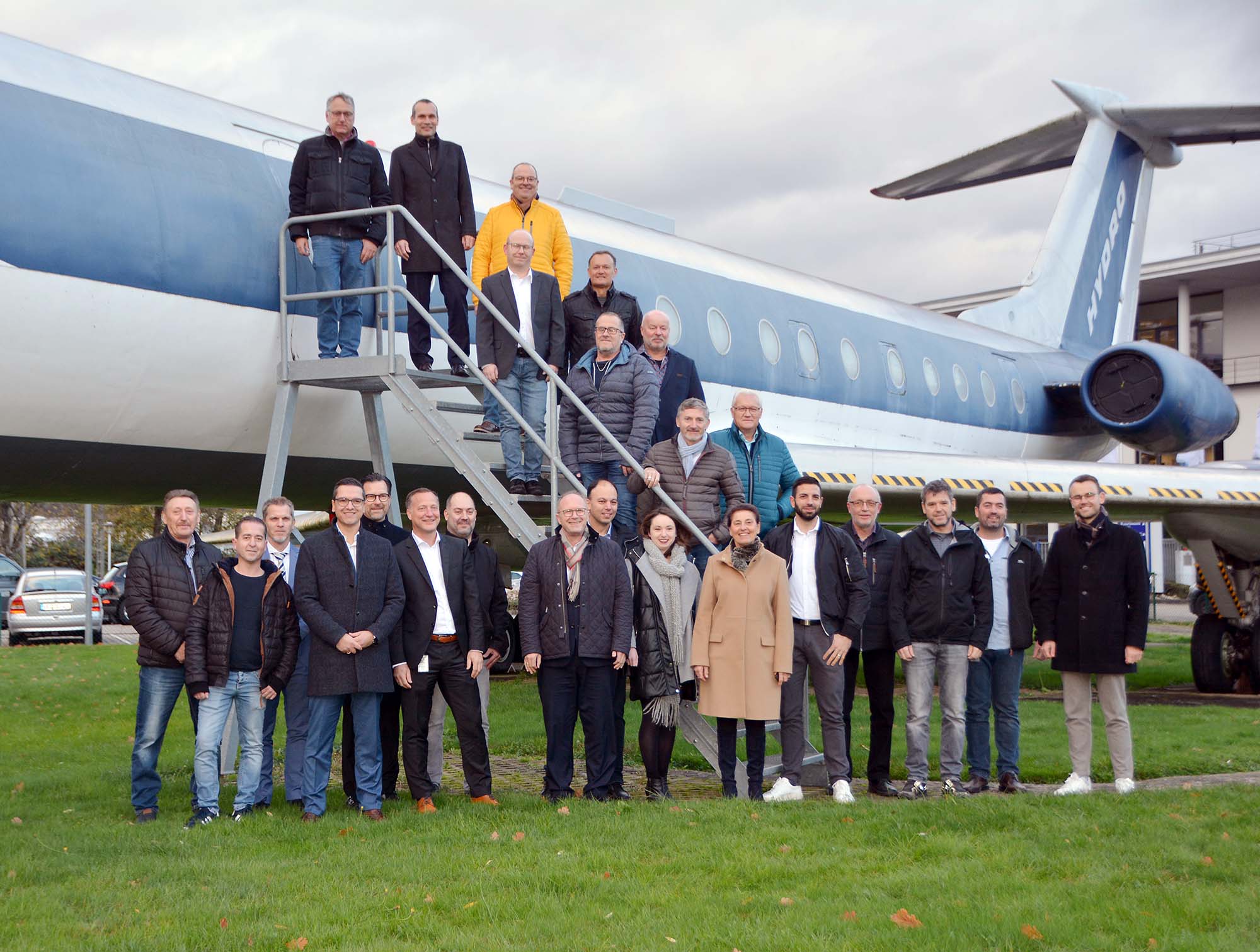 Zunächst bildete der Hydro-Flieger auf dem Werksgelände die Kulisse für die Erinnerungsfotos an das Arbeitsjubiläum. Neben den Jubilaren waren auch der Führungskreis des Unternehmens sowie Bürgermeister Jonas Breig gekommen, um die Leistungen der langjährigen Mitarbeiter zu würdigen. Allen voran konnten Michael Schätzle und Clemens Isenmann für 30 Hydro-Jahre geehrt werden.