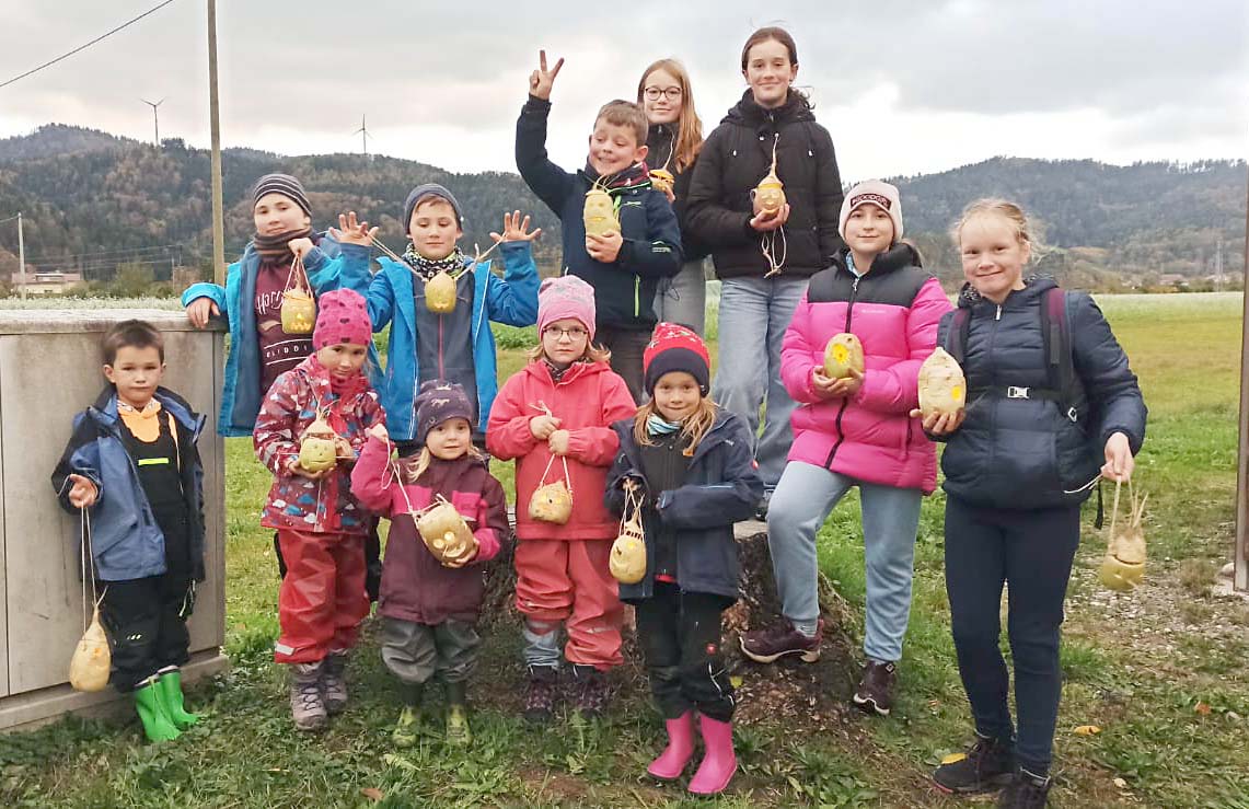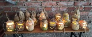 Dann ging es vor Anbruch der Dämmerung auch schon los mit der Schnitzerei. Jedes Kind erschuf seinen eigenen Geist mit ein klein wenig Hilfe der Großen oder auch ganz alleine mit geübter Hand. Das Er staunen und Raunen über das wirkungsvolle Ergebnis mit den flackernden Gesichtern der Rübengeister war groß. Alle Kinder konnten nun mit Feuerschein zurück ins Dorf laufen.