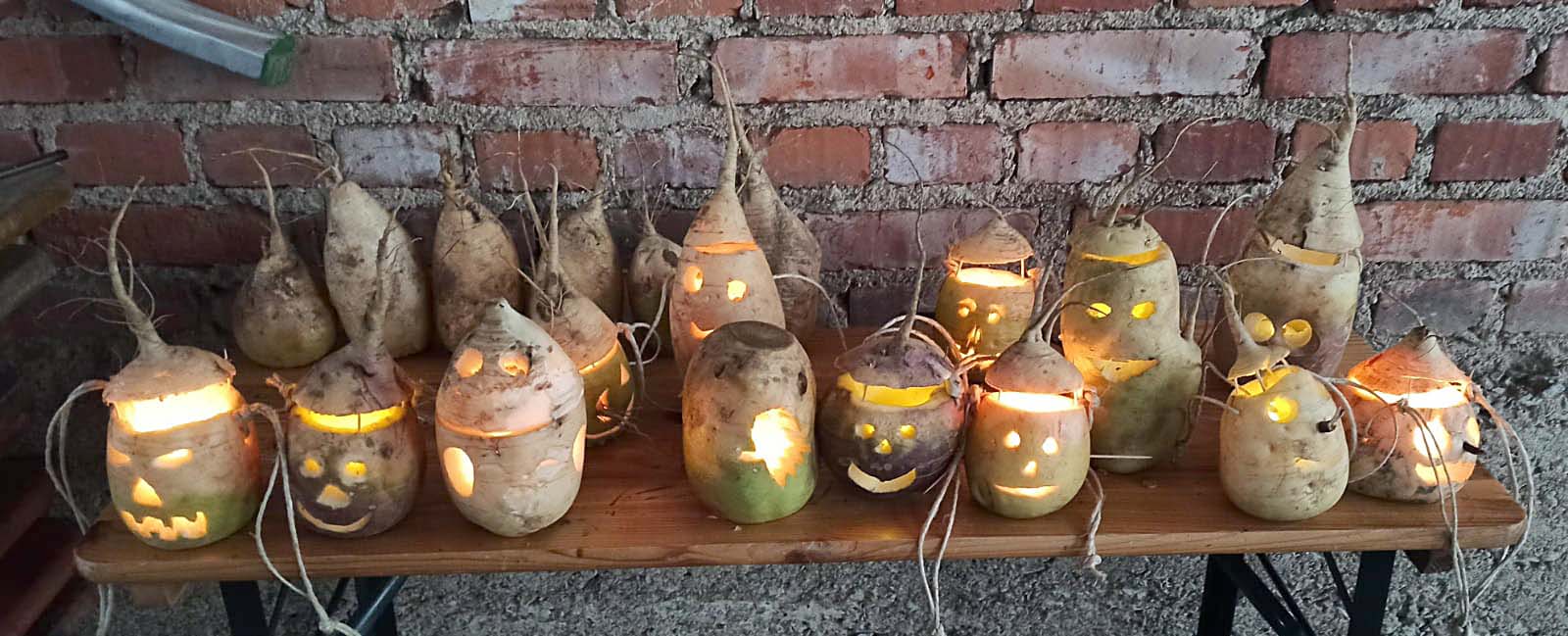 Kürbisse mit Fratzen und schauerlichen Figuren und Mustern gab es zu Halloween auch in Biberach zu Hauf, doch die „heimischen Rübengeister“ sind selten geworden. Dabei braucht man dazu lediglich eine Futterrübe, ein Schnitzmesser, ein Stückchen Schnur, ein Teelicht und vielleicht den ein oder anderen guten Tipp von den beiden Leiterinnen Anja Schwarz und Sabrina Wiedmer, die gemeinsam mit den Familien die Rübengeister lebendig werden ließen.
