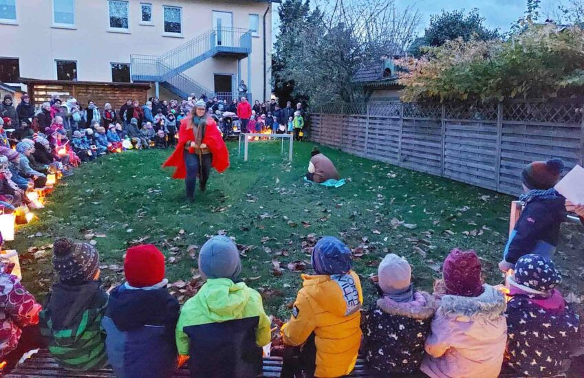 Im Hof des Kindergartens St. Blasius wurden ebenfalls Martinslieder gesungen und das Martinsspiel im Schein der Laternen aufgeführt. Mit einem Halt am Alten Kirchturm und am Pflegeheim erfreuten die Familien die Bewohner und das Personal des Heims Kappellenblick.
