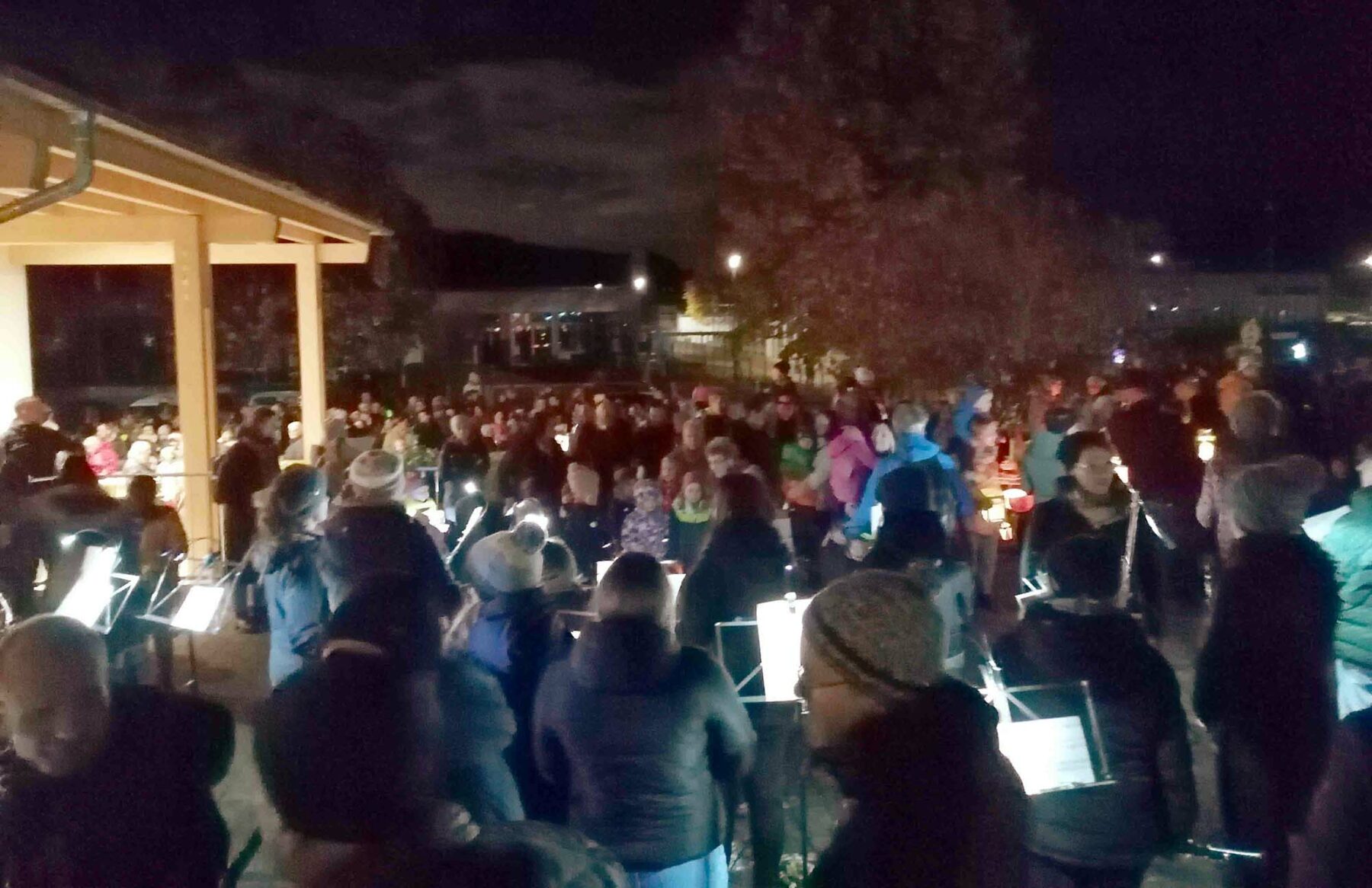 Begleitet und beschützt von Feuerwehr und THW kamen alle drei Gruppen auf dem Schulhof an. Hier versammelten sich die insgesamt rund 600 Teilnehmer der drei Umzugsgruppen. Es gab Musik vom Blasorchester Biberach und einen Lichtertanz. Die Kinder freuten sich auf den Übergang zum geselligen Teil: Alle Laternenkinder bekamen eine Brezel von der Kirchengemeinde geschenkt. Es herrschte überall dichtes Gedränge, denn auch Punsch und Glühwein sowie Gebäck an den beiden Ständen des Elternbeirats des Kindergartens St. Blasius waren heiß begehrt.