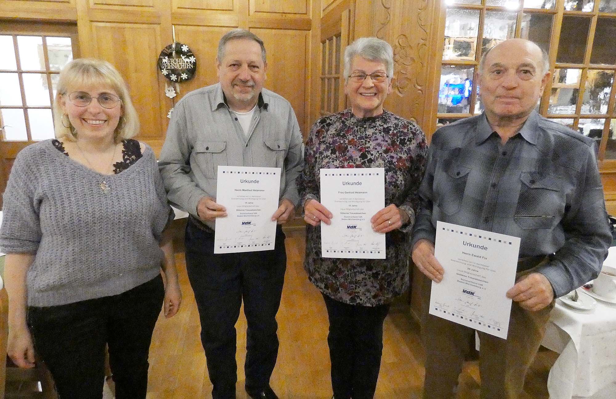 Zwölf Ehrungen langjähriger Mitglieder hätte Vorsitzende Manuela Ringwald-Moog im Anschluss gerne vorgenommen, zu ihrer großen Enttäuschung folgten jedoch nur drei einer entsprechenden Einladung. So erhielt Ewald Fix für 25 Jahre Mitgliedschaft das Treue-Abzeichen in Gold, samt Urkunde des Sozialverbandes VdK Baden-Württemberg sowie ein Präsent. Manfred und Gertrud Heizmann wurden für jeweils zehn Jahre mit Silber ausgezeichnet.