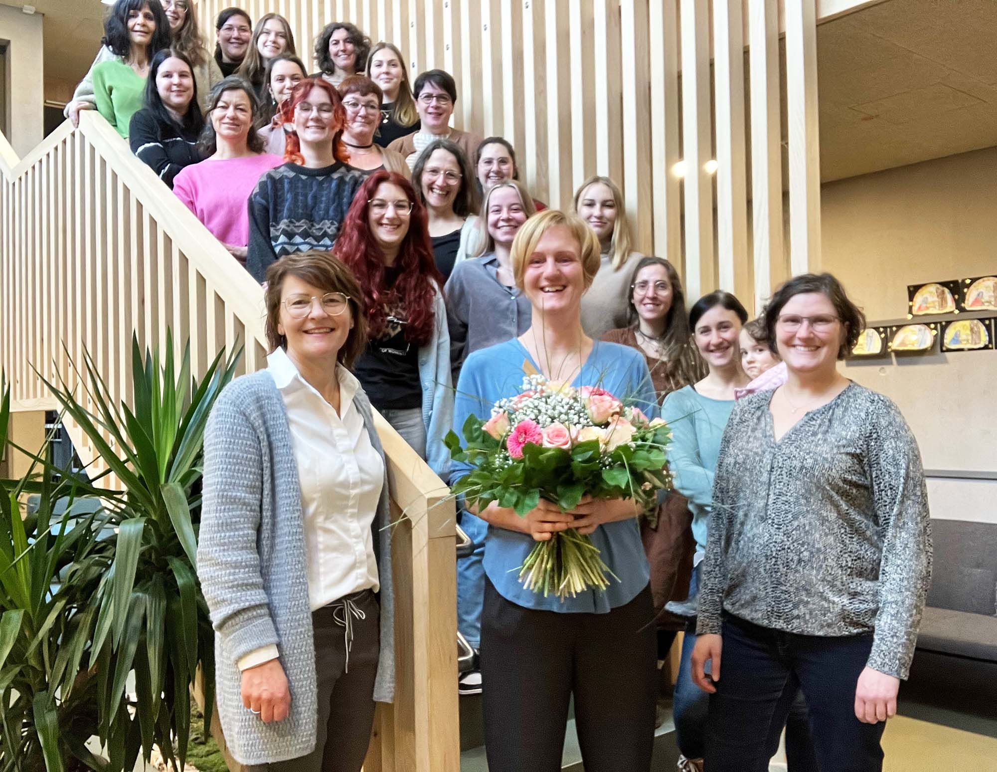 Geschäftsführerin Angela Schätzle und Ute Baur, Stiftungsrätin der kath. Kirchengemeinde Zell a. H., gratulierten beim pädagogischen Planungstag der neuen Leitung mit Blumen und wünschten eine geschickte Hand bei der ver antwortungsvollen Aufgabe. Mit Freude schloss sich das gesamte pädagogische Team den Glückwünschen an.