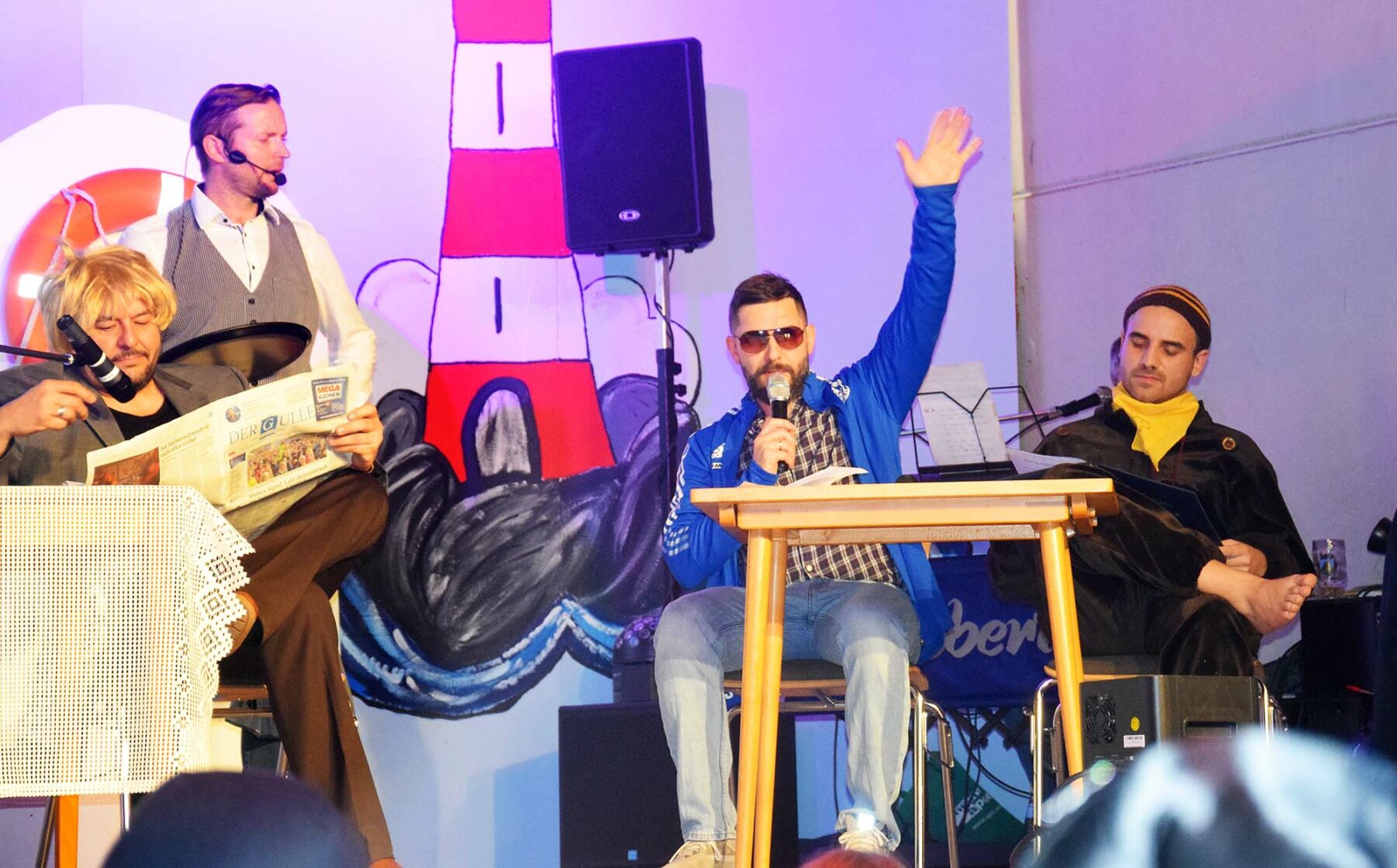 Schon beim „Check-In“ ging es für die skurrilen Gäste turbulent zur Sache. Während der „Spießer“ mit massenweise Sonnencreme pflegetechnisch top vorbereitet war, haben sich die „drei Tussis“ die halbe Ausrüstung vom „Figaro“ organisiert um die Frisur „in shape“ zu halten. Auch für die „Bieberwieber“ am Pool schien das Tagesziel klar definiert – langsam wenden und auf „Döner-Spieß“ machen – bis die rasante Fitness-Queen herbei preschte und zur Pool-Gymnastik aufforderte. Da ging es beim „A-Team“ im „Schiffskaffee oberes Dicht“ deutlich geruhsamer zu. Im Liegestuhl lang ausgestreckt erfreute man sich der Kreuzfahrt und frohlockte, dass das Zeller Bändele keinen Zutritt erhielt: „Schließlich ist das hier eine Kreuzfahrt und keine Altpapiersammlung!“