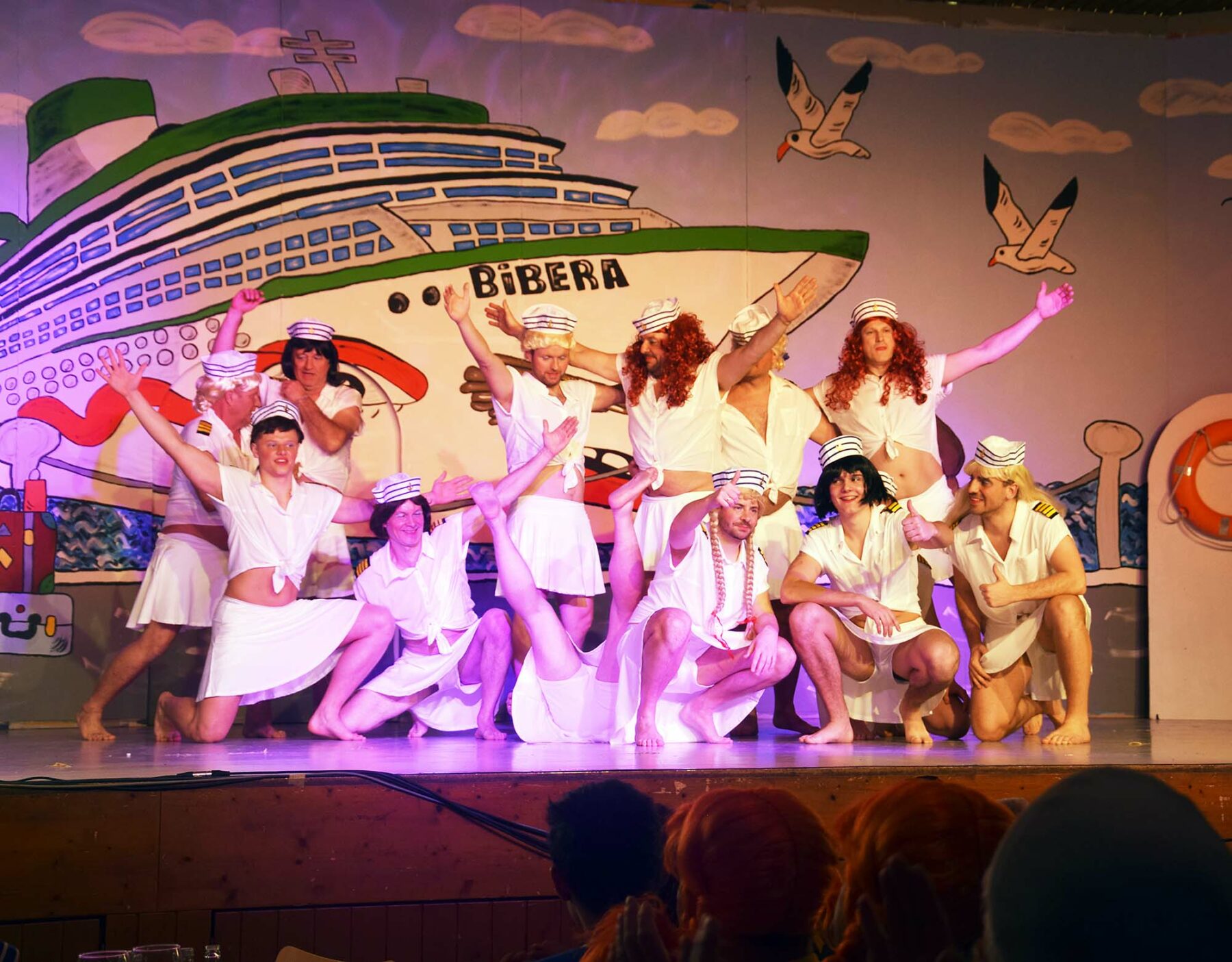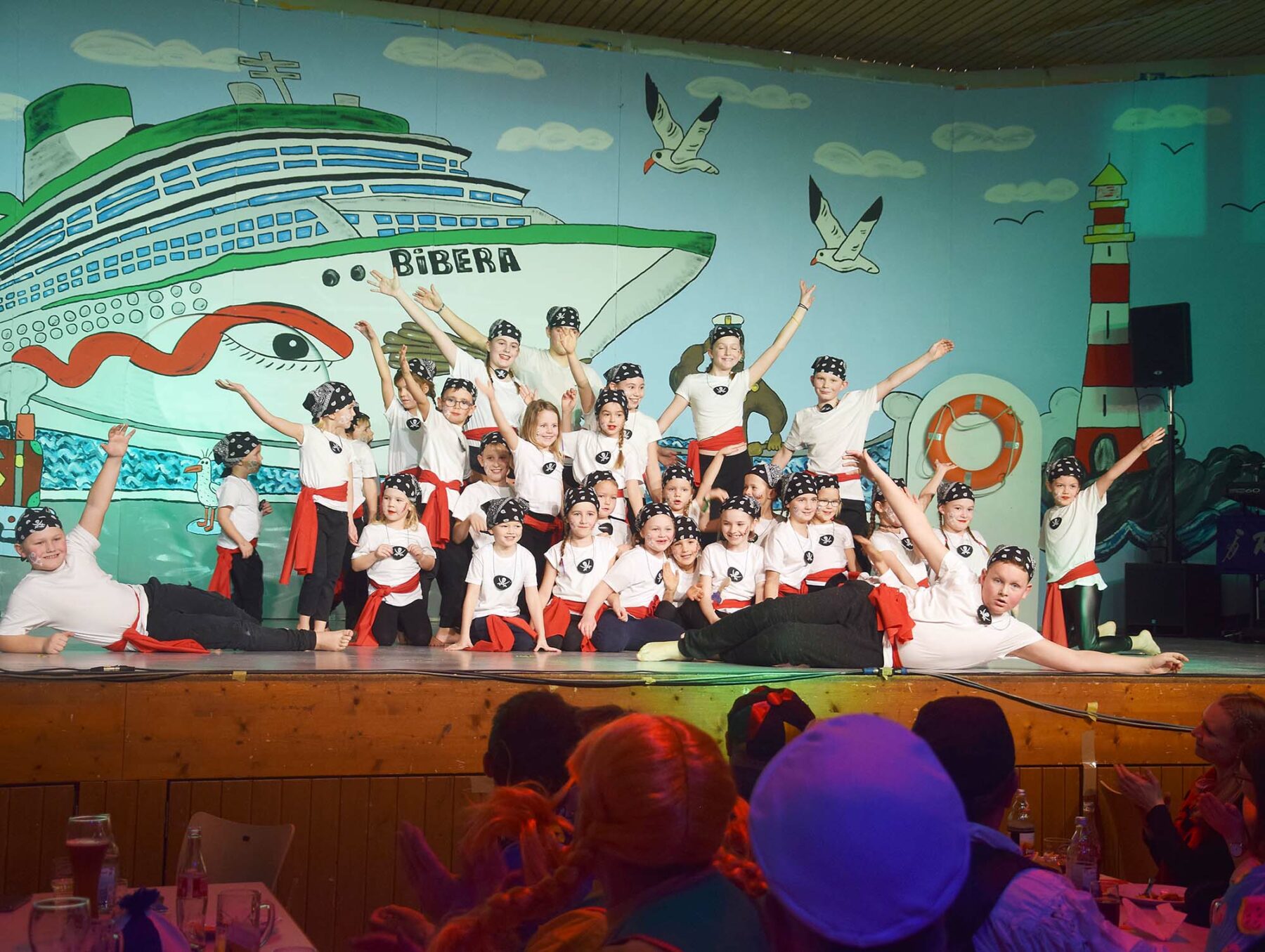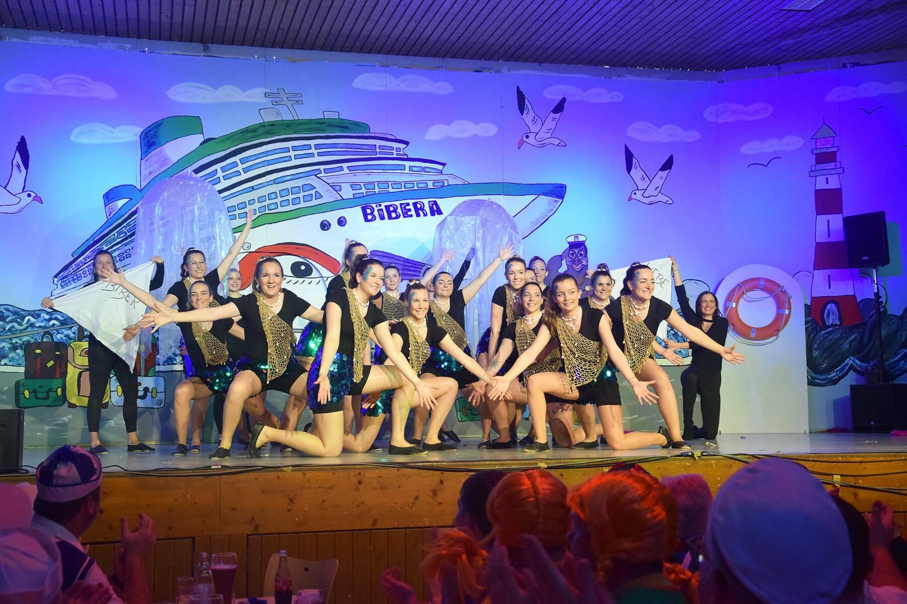 Imposant waren die Tanzgruppen. Sie beeindruckten nicht nur durch die große Anzahl der Protagonisten, sondern vor allem durch die Freude am Tanz, der ausgefeilten Choreografie oder der maskulinen Präsenz. Viel Spaß bereitete der Piratentanz des Kinderballetts. Passend zu „Santiano“ wirbelten mehr als 30 Kids über die Showbühne. Vor allem als die Kleinsten im Alter ab drei Jahren auf die Bühne stürmten und begeistert „mitzappelten“ hielt es das Narrenvolk nicht mehr auf den Stühlen. Romantisch und verträumt zur Titelmelodie von „Titanic“ entführte das Damenballett in die Unterwasserwelt. Richtig die Post ab ging dann mit dem Partyhit „Vamos a la playa“. „What should we do with the drunken sailor?“ fragte das Gemischte Ballett und präsentierte einen wilden und temperamentvollen Showtanz. Keck blitzende blanke Bauchmuskeln lugen unter den dünnen Hemdchen hervor … es war Zeit für das Männerballett. Als fesche Bord-Stewardessen – wahlweise mit Zopf oder voller Mähne dominierten sie die Bühne und wagten sogar todesmutig eine gefährliche Hebefigur. Ein würdiger Schlusspunkt für einen fulminanten Biberball. Anschließend wurde noch bis in die frühen Morgenstunden ausgelassen gefeiert.