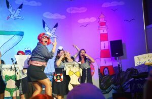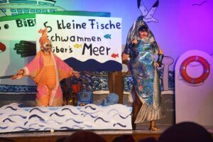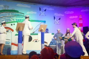 Einsam aber bestens informiert war der Wirt des Schiffskiosks. So ist ihm auch nicht entgangen, dass der Zeller Bürgermeister bestens für seine „Insassen“ sorgt: „Dank der neuen Beleuchtung in der Entersbacher Dorfstraße sehen die Zeller jetzt das Licht am Ende des Tunnels, wenn sie nach Biberach schauen“. Als „Meeresfrüchtchen“ traten die „Golden Girls“ im Ballsaal des Ozeanriesens auf. Mittlerweile in der „Ü50-Klasse“ angekommen, kämpften sie um ihre Fitness. Besonders die fesche „Regenbogenforelle“ (Evi Lehmann) sah nach monatelangem Ausharren in der Frischhaltetheke vom Ex-Edeka Thiem ihr persönliches Verfallsdatum noch nicht erreicht: „Ich habe meine 328.800 Wörter heute noch nicht abgeschwätzt“ behauptete sie ihren Platz auf der Bühne.