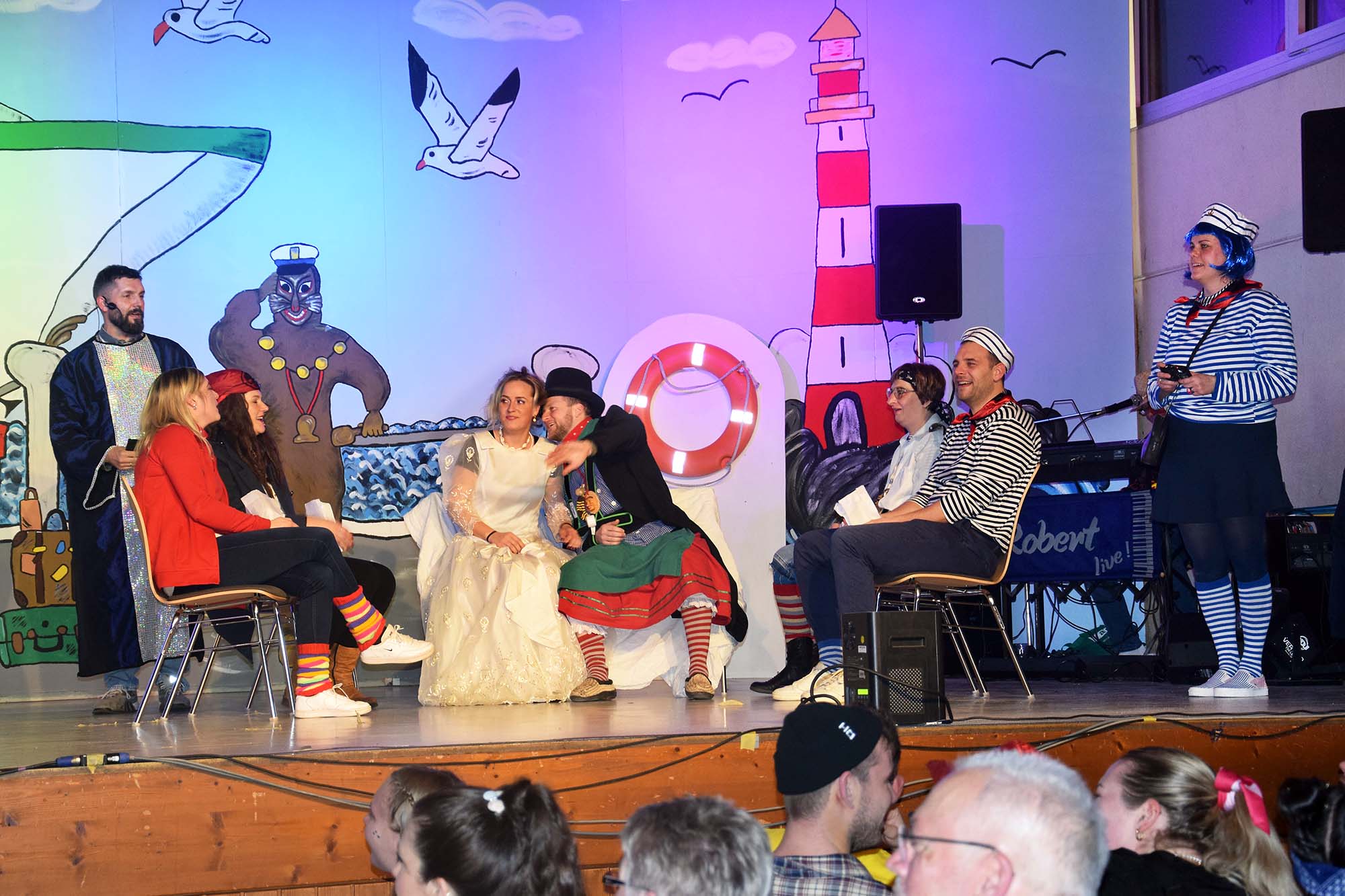 „Was wäre das Meer ohne Traumschiff und das Traumschiff ohne Traumhochzeit?“ – unter diesem Motto formierte sich nach und nach ein Highlight des Abends. Aus der Mitte des Narrenvolkes wurden die Trauzeugen und ein Hochzeitsfotograf rekrutiert. Als Priester wurde kurzerhand Oberbiber Andreas Schmider bestimmt – Hallelujah! Bis zuletzt war offen, wer denn „Braut“ und „Bräutigam“ wird – und ob es um einen echten Hochzeitsantrag oder „nur“ eine Show ging.