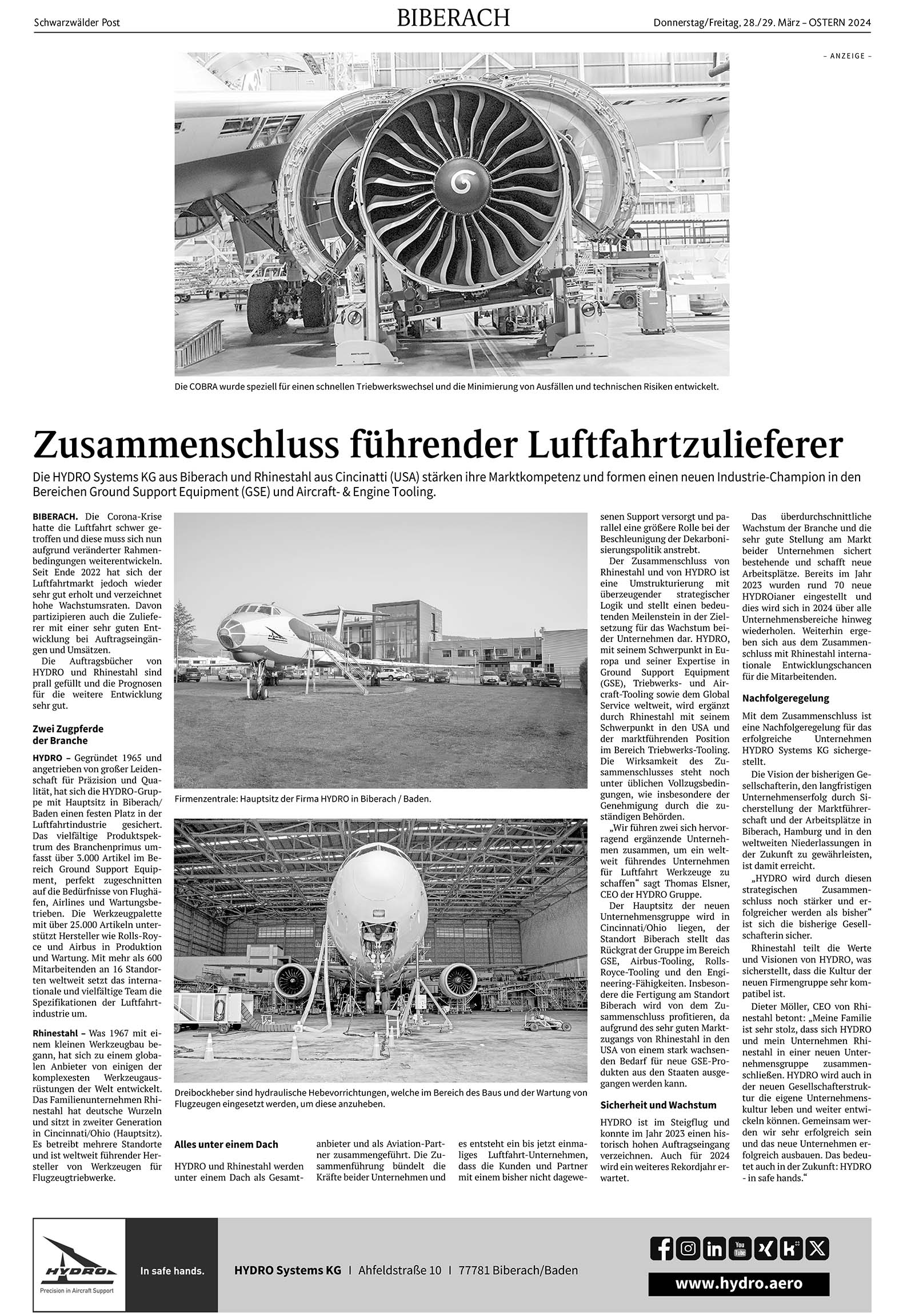 - Anzeige -Anzeige, Biberach | 28.03.2024 Zusammenschluss führender Luftfahrtzulieferer Foto:Firmenzentrale: Hauptsitz der Firma HYDRO in Biberach / Baden. Foto: Unternehmen von Hydro Systems BiberachDie HYDRO Systems KG aus Biberach und Rhinestahl aus Cincinatti (USA) stärken ihre Marktkompetenz und formen einen neuen Industrie-Champion in den Bereichen Ground Support Equipment (GSE) und Aircraft- & Engine Tooling. Foto: UnternehmenDas könnte Sie auch interessieren:Foto: Susanne VollrathSo viel Erfahrung steckt in 29 Hydro-JubilarenDer SKC Unterharmersbach steht kurz vor…Foto: Susanne VollrathVier Wege, Kunst zu erfahren