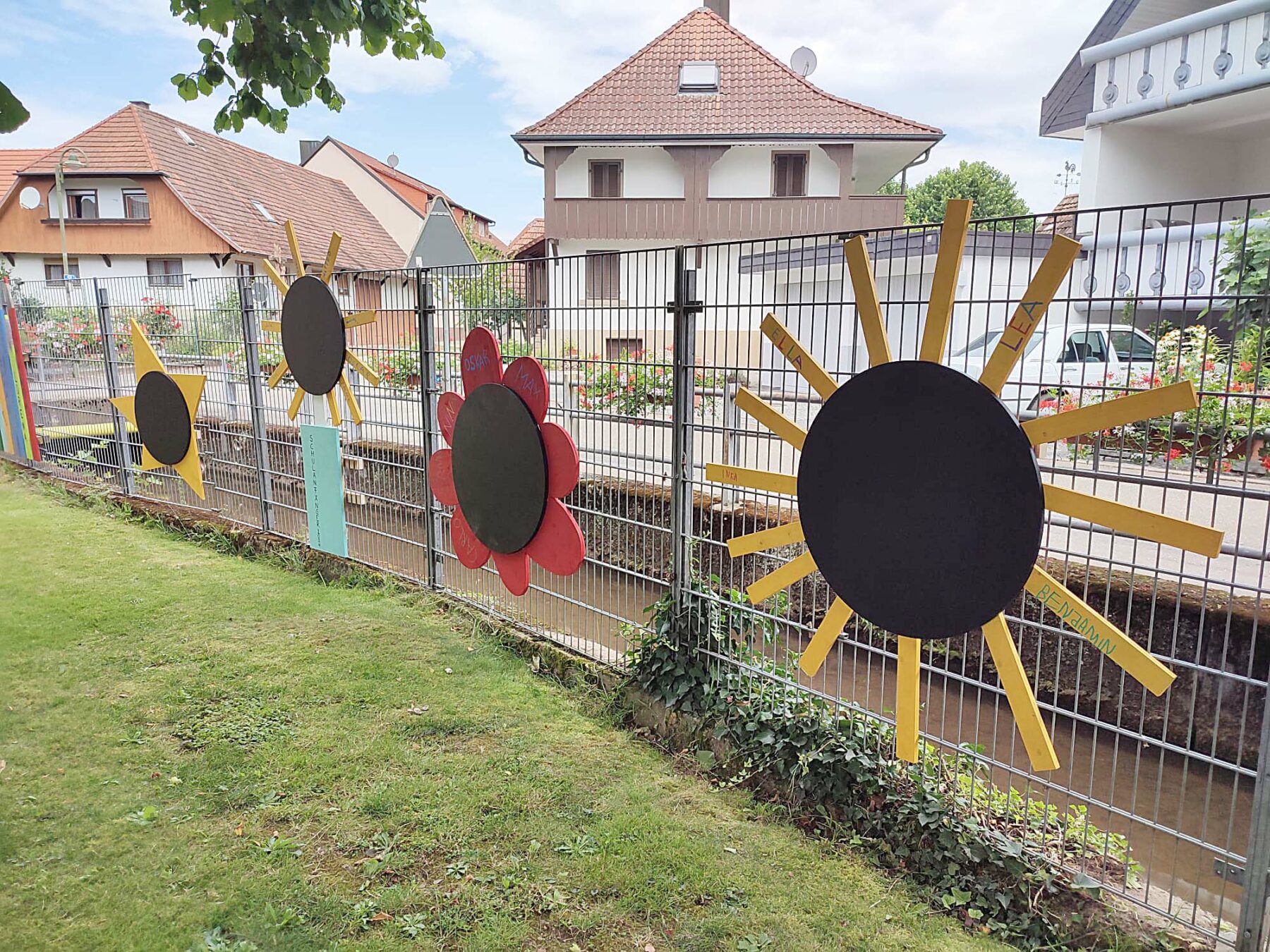 Anschließend versammelten sich alle im „Bächle-Hof“ des Kindergartens. Hier überreichten die Schulanfänger ihr Abschiedsgeschenk: Vier Maltafeln in den Symbolen Stern, Licht, Blüte und Sonne, die für die vier Gruppen des Kindergartens stehen. Jeder Schulanfänger hatte sich auf seinem Symbol mit seinem Namen verewigt. Zusammen mit den Maltafeln wurde eine Schatzkiste mit Kreidestiften übergeben, sodass sofort losgemalt werden konnte.
