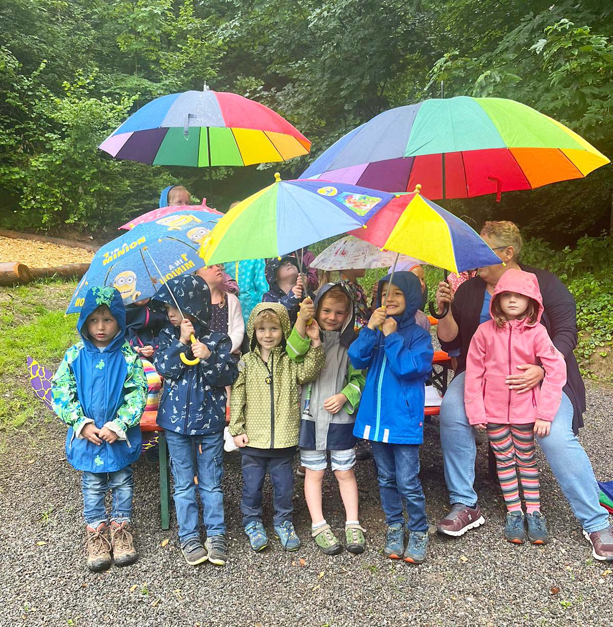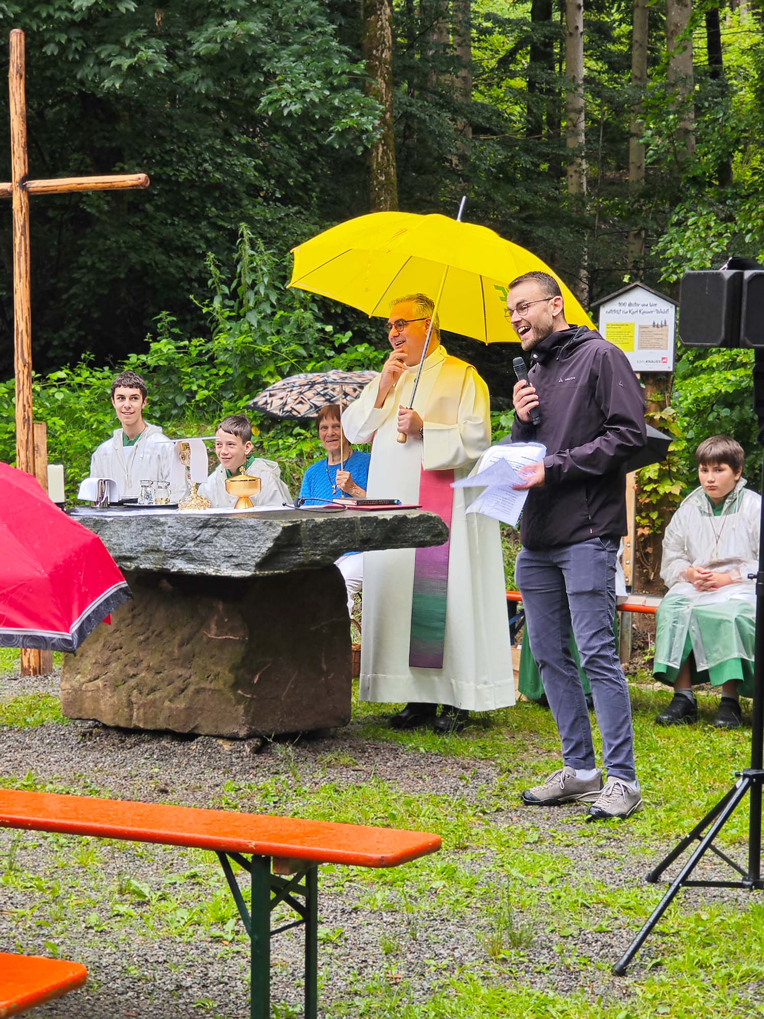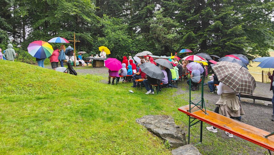 Der Tag begann um 11 Uhr an der Luisenhütte mit einem gut besuchten Gottesdienst. Pfarrer Bonaventura Gerner und der Kinderchor KiKiBi, geleitet von Ilka und Samira Heizmann, sorgten für eine feierliche Atmosphäre. Die Schirme wurden aufgespannt, die Ministranten schlüpften in Regenmäntel. In den Fürbitten baten die Kinder um Schutz, Liebe und Fürsorge für alle. „Du hast uns deine Welt geschenkt“ sangen die KiKiBi-Kinder vom Regengeplätscher unbeeindruckt. Pfarrer Gerner hob hervor, wie wichtig Spiel und Bewegung für Kinder sind – „ein Grundbedürfnis“, und lobte den neuen Spielplatz an der Luisenhütte. Nach dem Gottesdienst segnete er den Platz und die Besucher.