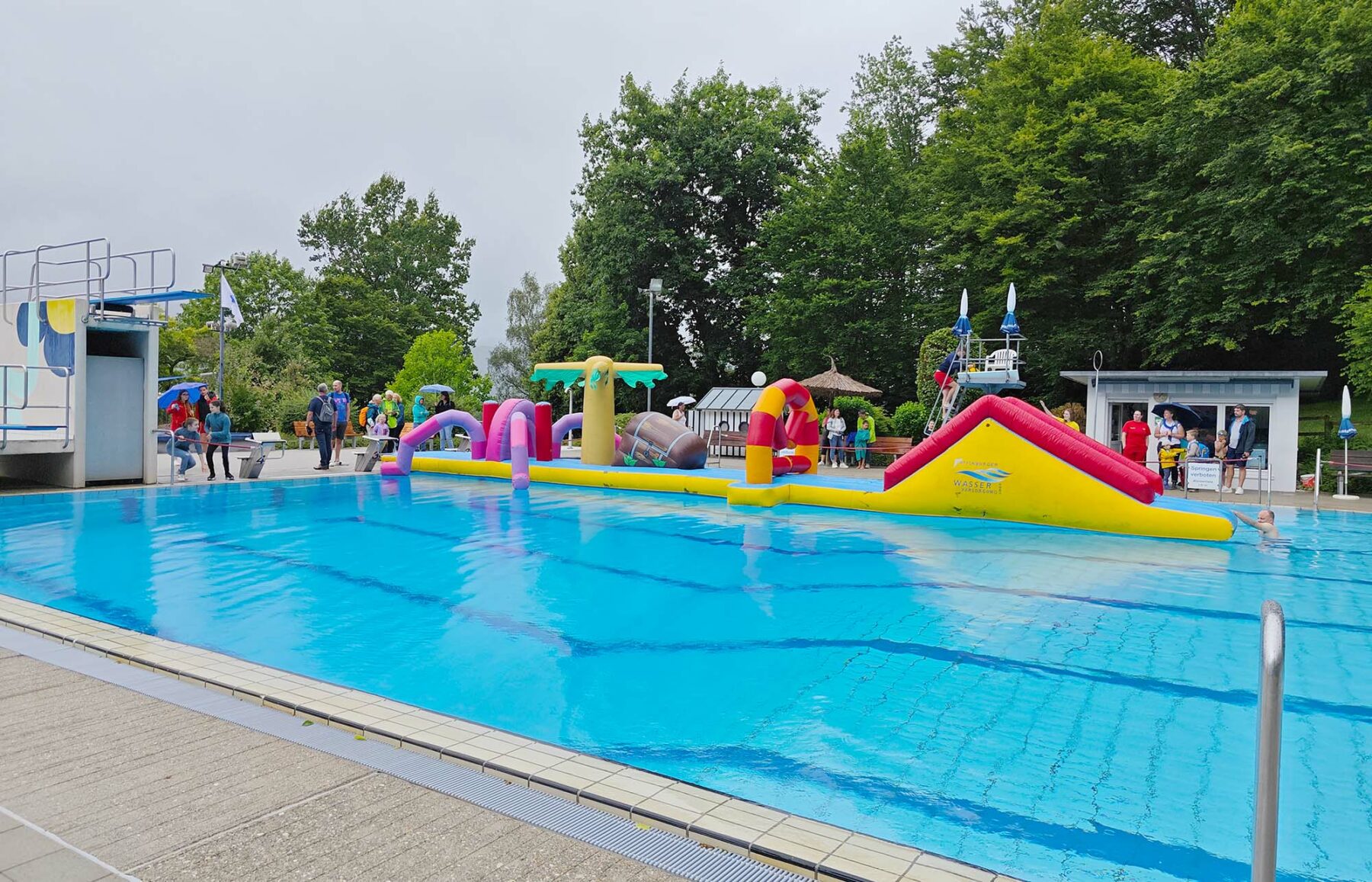 Am Nachmittag zog es viele ins Schwimmbad, wo die DLRG das Biberschwimmabzeichen vorstellte. Oberbiber Michael Weng, Oberbiberin Evi Lehmann und zwei Jungbiber zeigten ihr Können. Staunende Kinderaugen gab es Zuhauf, als ein Biber im Häs die Rutsche hinuntergesaust kam und seine Runden mit Transport eines Holzstückes durchs Becken zog. Launig moderiert und angefeuert durch zahlreiche Unterstützung aus den Zuschauerreihen erledigte der Biber seine Aufgaben mit Bravour. Viele große und kleinen Gäste ließen sich im Anschluss nicht lange bitten und stürzten sich selbst ins kühle Nass. Ein Parcours im Becken steigerte den Spaßfaktor noch einmal immens. Evi Lehmann schwamm im Biber kostüm, sehr zur Freude der Zuschauer. Ein Parcours im Becken sorgte für zusätzlichen Spaß.