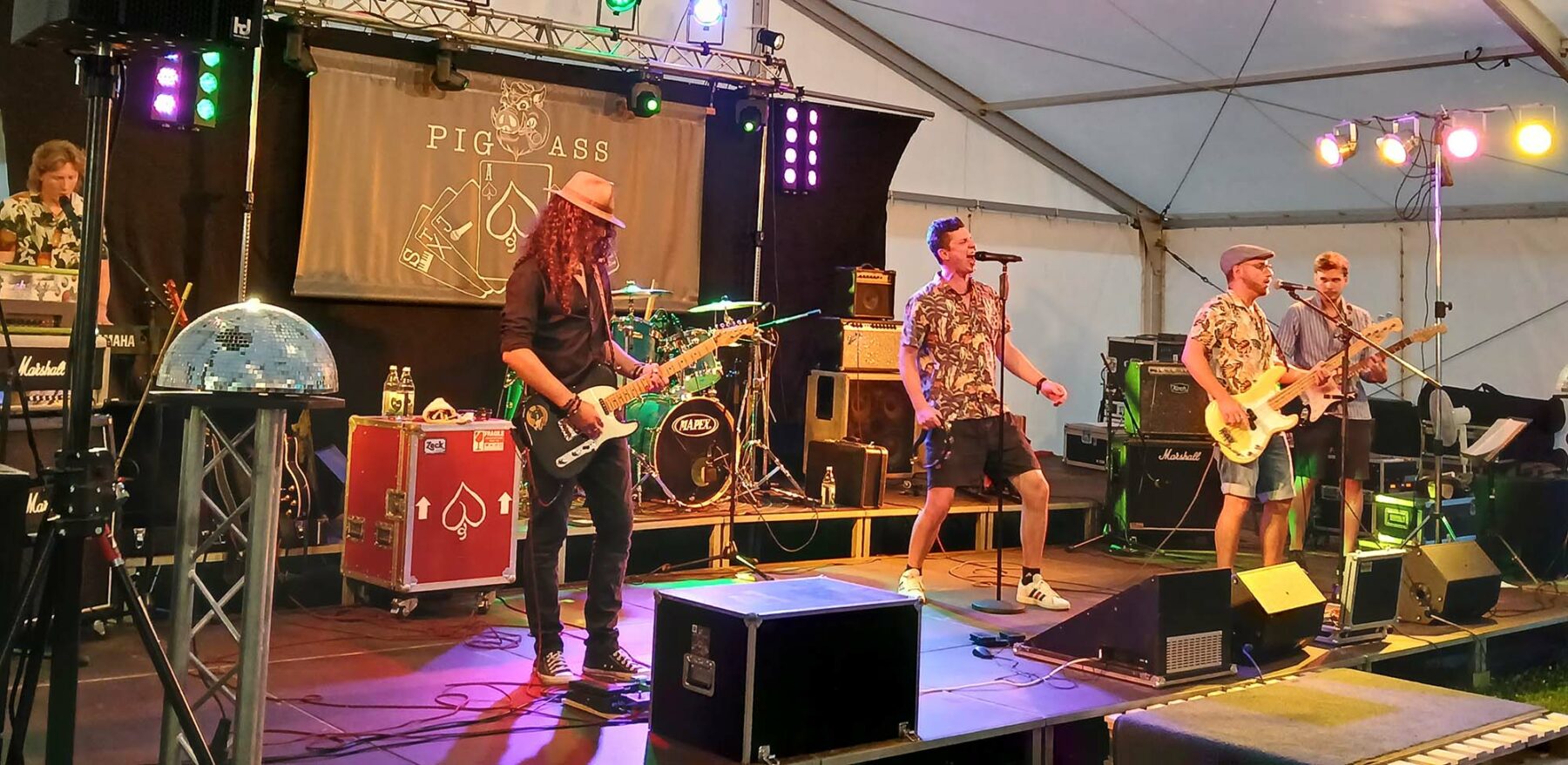 Im Anschluss betrat die Cover-Rockband „Pig Ass“ die Bühne. Im Jahr 2023 auf dem Dorffest noch als Überraschungsgast mit ihrem ersten Auftritt angekündigt, waren sie in diesem Jahr der Hauptact. Von Beginn an heizten die Jungs, drei davon Eigengewächse des Musikvereins Biberach, den Zuhörern ordentlich ein. Die Band war bestens vorbereitet und lockte viele Besucher ins Festzelt vor die Bühne. Die Gäste kamen in den Genuss einer ausgezeichneten Auswahl erlesener Rockklassiker. „Pig Ass“ überzeugte mit abwechslungsreichem und mitreisendem Coverrock. Titel wie „Can`t Stop“ von den Red Hot Chili Peppers, „The Pretender“ von den Foo Fighters oder „Hier kommt Alex“ von den Toten Hosen waren zu hören. Der Spass und die Leidenschaft der Jungs war unverkennbar und viele Besucher feierten ausgelassen mit ihnen. Zahlreiche andere Gäste machten es sich neben dem Zelt im Außenbereich des Festgeländes mit einem Cocktail gemütlich.