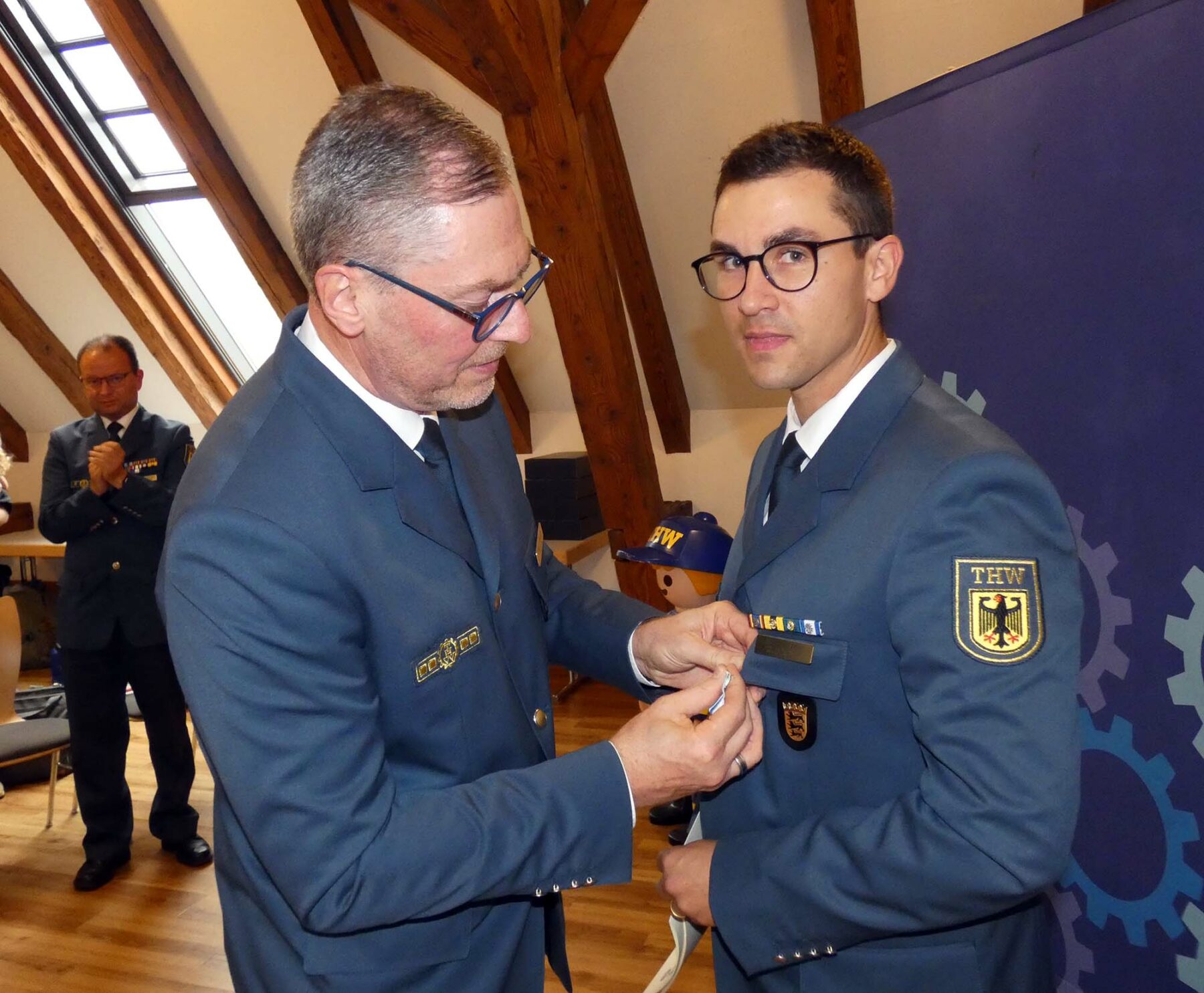 Als Vizepräsident in der Bonner THW-Behördenleitung nahm dieser die Ehrung der drei Biberacher THW-ler vor: In Anerkennung deren langjährig-ehrenamtlichen Engagements im THW und damit der Verdienste um den Zivil- und Katastrophenschutz überreichte er jeweils das THW-Ehrenzeichen in Bronze. Zuvor verlas er die jeweilige Laudatio.