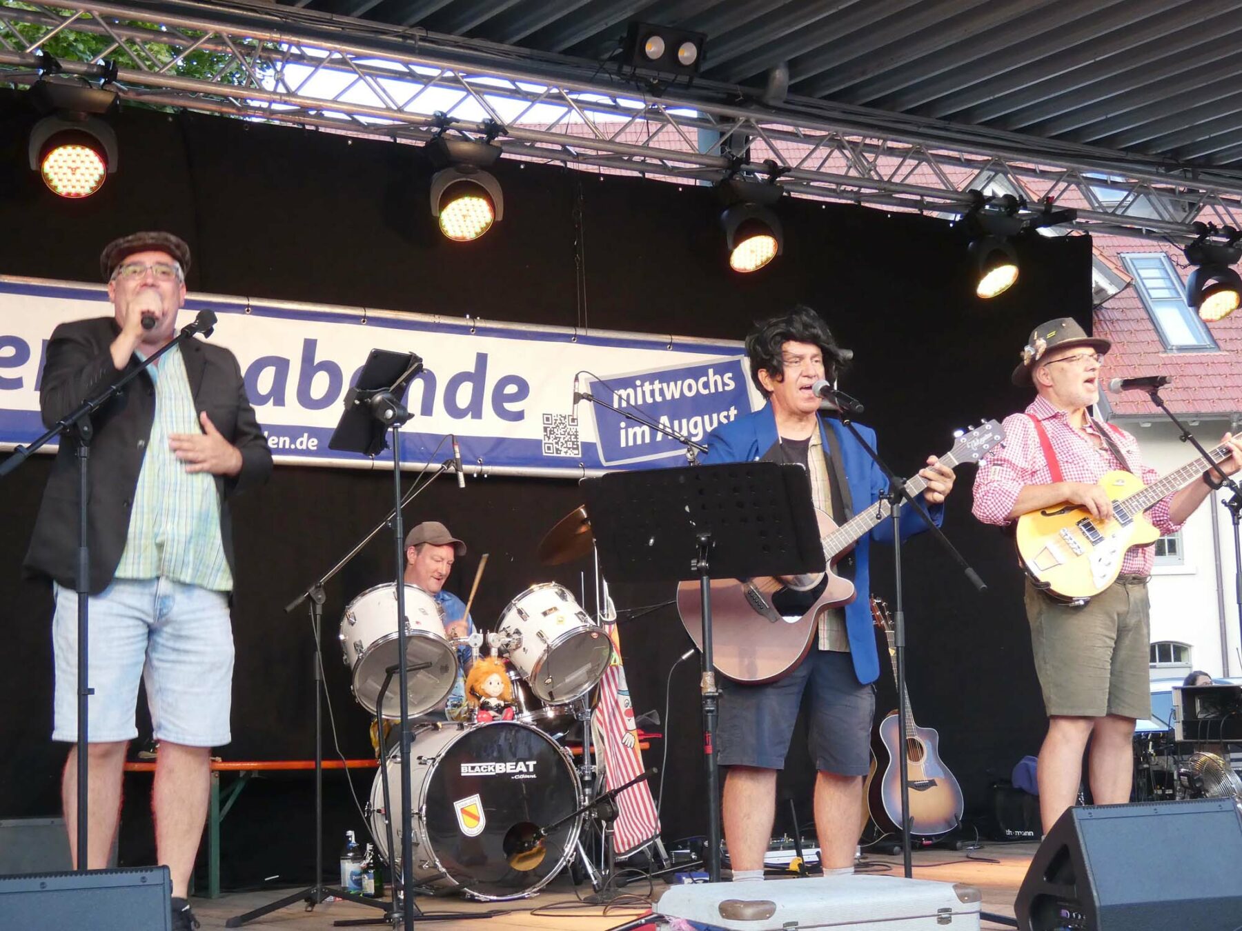 Köstlich amüsierte sich das Publikum bei der „badischen Begrüßung“. Auf der einen Seite des Platzes erhoben sich die Zuhörer weisungsgemäß von den Bänken, um denen auf der anderen Seite zuzuwinken und fröhlich zu fragen: „Hallo, wie geht es Euch?!“ Die Antwort gab das Buurequartett rotzfrech vor: „Des geht euch einen Schissdreck an!“ In diesem Stil ging es bis zweiundzwanzig Uhr weiter: mit skurrilen Verkleidungen und nicht minder ulkig (auch um-) getexteten Songs, mit variantenreichen Rhythmen, Kalauern, aber-witzigen Sketchen und einem Publikum, dass sich immer wieder willig zum Mitsingen und Mitklatschen animieren ließ.