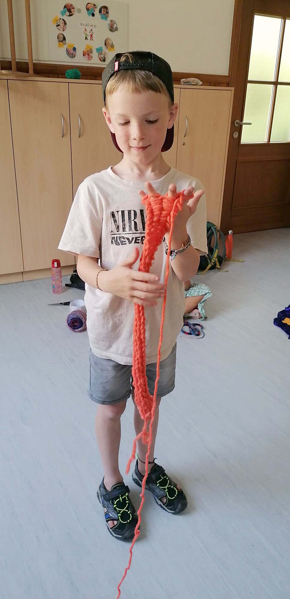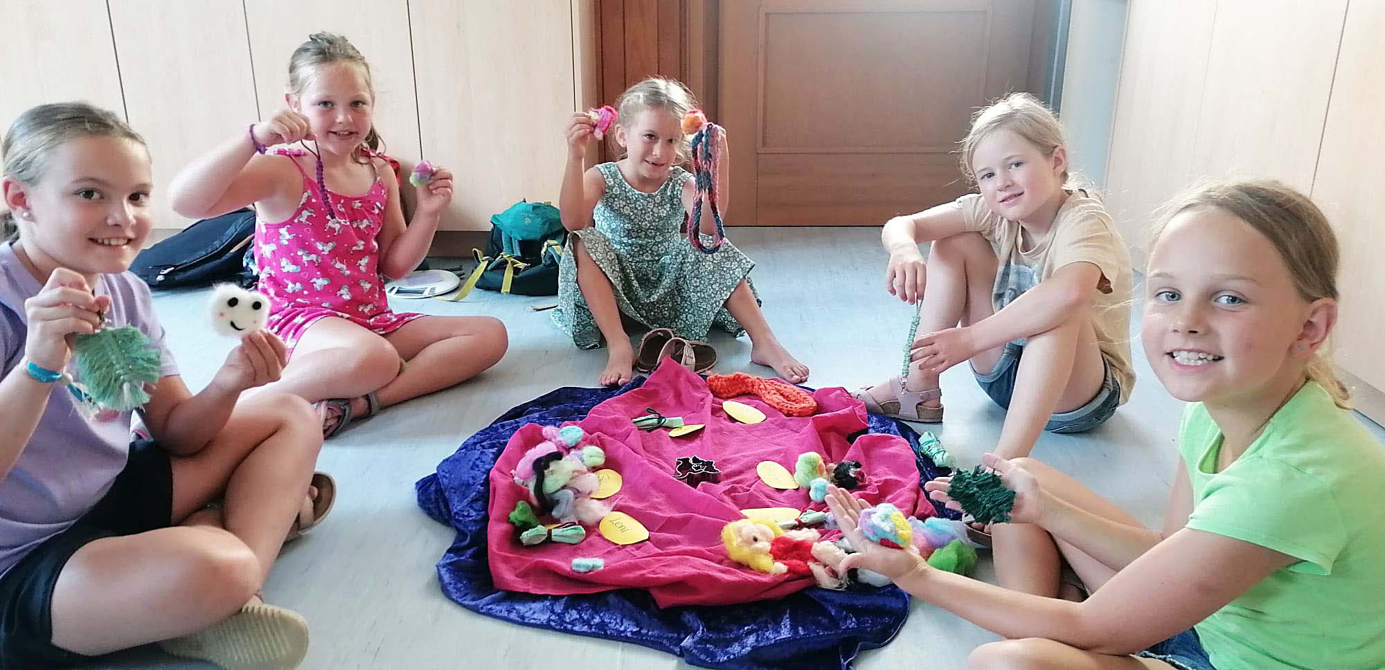 Gleich zu Beginn der Ferien trafen sich sechs Kinder im Grundschulalter, um gemeinsam verschiedene Techniken rund um Wolle & Garn in spielerischer Atmosphäre kennenzulernen. Es wurden Armbänder geknüpft, Makramee-Schlüsselanhänger hergestellt und kleine Stücke gefilzt. Außerdem konnten die Kinder eine vereinfachte Form des Strickens ohne Nadeln, aber dafür mit einer Strickgabel oder an den eigenen Fingern ausprobieren.