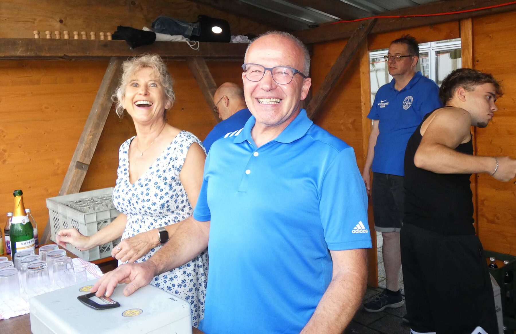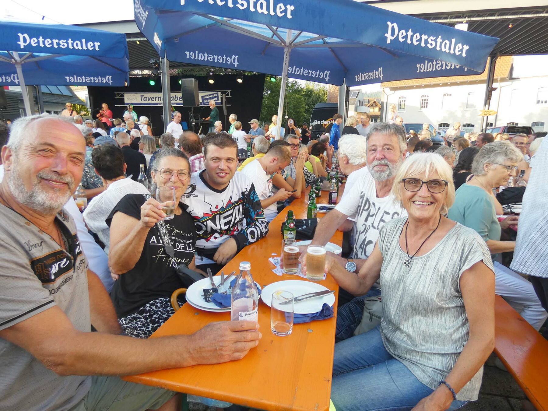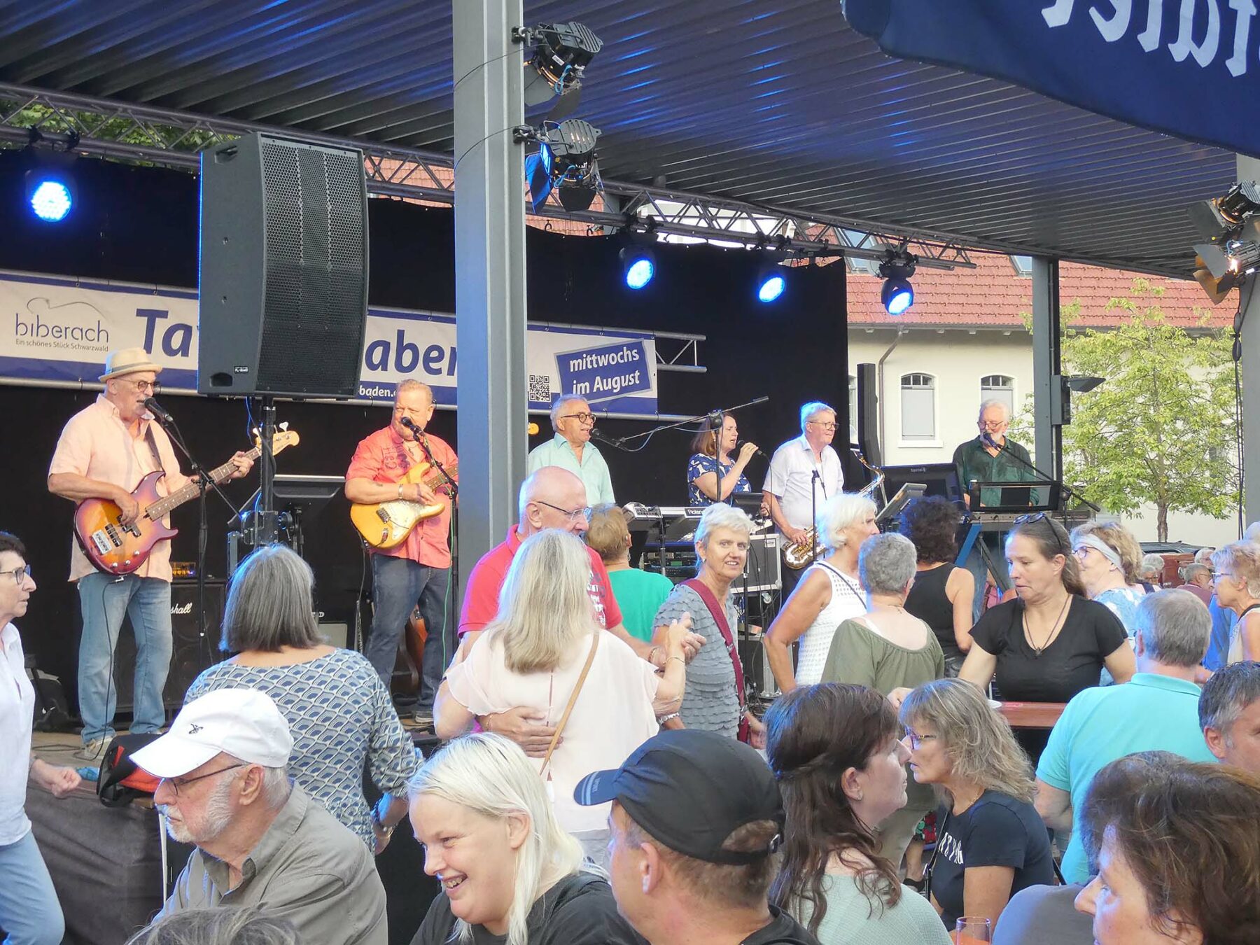 lücklicherweise währte die Himmelsdusche nur kurz und die Sonne strahlte wieder. Rasch trockengewischt – zur Not auch mit Taschentüchern -, füllten sich die Tische und Bänke im Nullkommanix. Und die tagsüber sehr hohen Temperaturen, die pendelten sich nun auf vergleichsweise angenehme Werte ein, zum miteinander „Klönen“ genau richtig. Und natürlich zum Tanzen. Ältere und jüngere Evergreens aus der Sparte Schlager, Rock und Pop luden so sehr dazu ein, dass der eigens freigelassene Platz vor der Bühne nicht ausreichte. Na und? Wozu schließlich gab es den auffordernd breiten Gang vor den Bewirtungsständen?