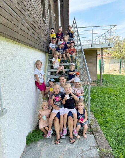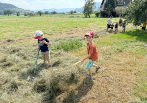 Dieses Jahr fiel die hofeigene Klaräpfel ernte sehr üppig aus. Daher zauberten die Kinder daraus ein leckeres Apfelmilcheis. Während die Eismaschine ihre Arbeit tätigte, durften die Kinder in der Wartezeit tatkräftig beim Heuen mithelfen oder im Schatten eines Apfelbaums von dessen Früchten naschen und dem bunten Treiben zuschauen.