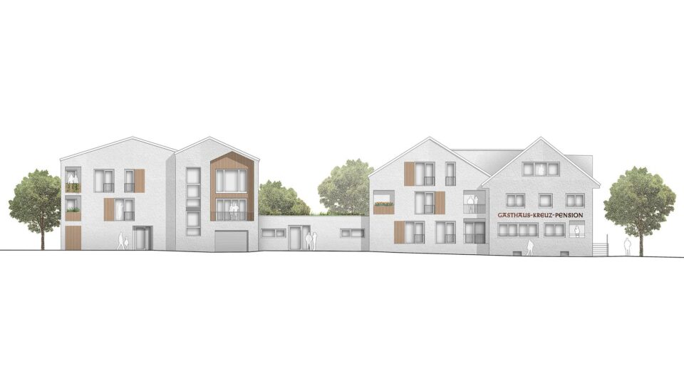 Die Firmengruppe orbau investiert rund 7,4 Mio. Euro in das Gasthaus Kreuz. Die ortsbildprägende ehemalige Gaststätte soll saniert und zum Wohnhaus umgebaut werden. Drei Neubauten auf dem großflächigen Areal ergänzen das Konzept. Insgesamt sollen 17 Wohnungen und eine Arztpraxis entstehen.
