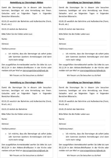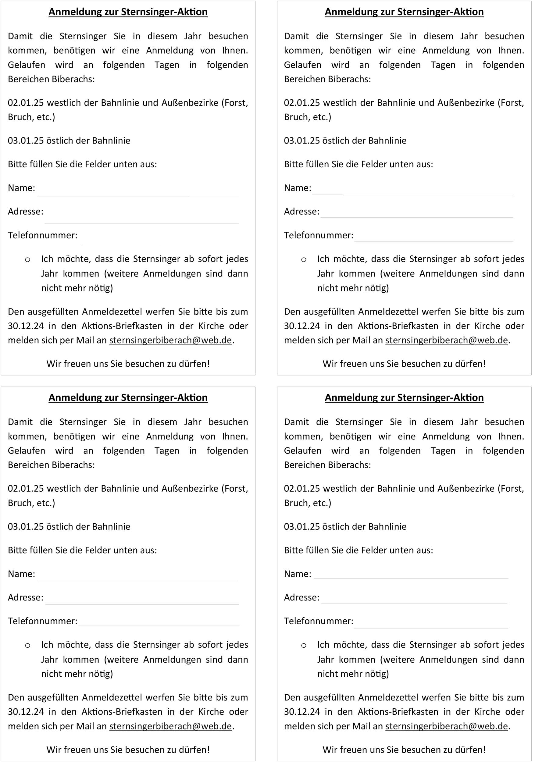 Wer den Besuch der Sternsinger wünscht, kann sich über den hier abgedruckten Anmeldzettel anmelden. Weitere Formulare liegen in der Kirche, Apotheke, Metzgerei Geiger, Figaro, Raiffeisen, Sparkasse und Bächle Beck aus. Diese können ausgefüllt in den Sternsingerbriefkasten in der Kirche eingeworfen werden. Der Briefkasten wird regelmäßig geleert, sodass der Datenschutz gewährleistet ist.