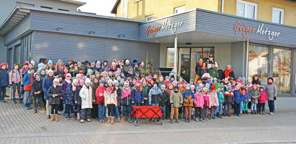 Und so zogen am frühen Mittwochmorgen alle Grundschüler bei Sonnenschein in Zweierreihen los. Die frohgelaunte Kinderschar war schon von weitem zu hören. Traditionell sind die ersten beiden Ziele die Metzgerei Geiger und anschließend die Sparkasse.
