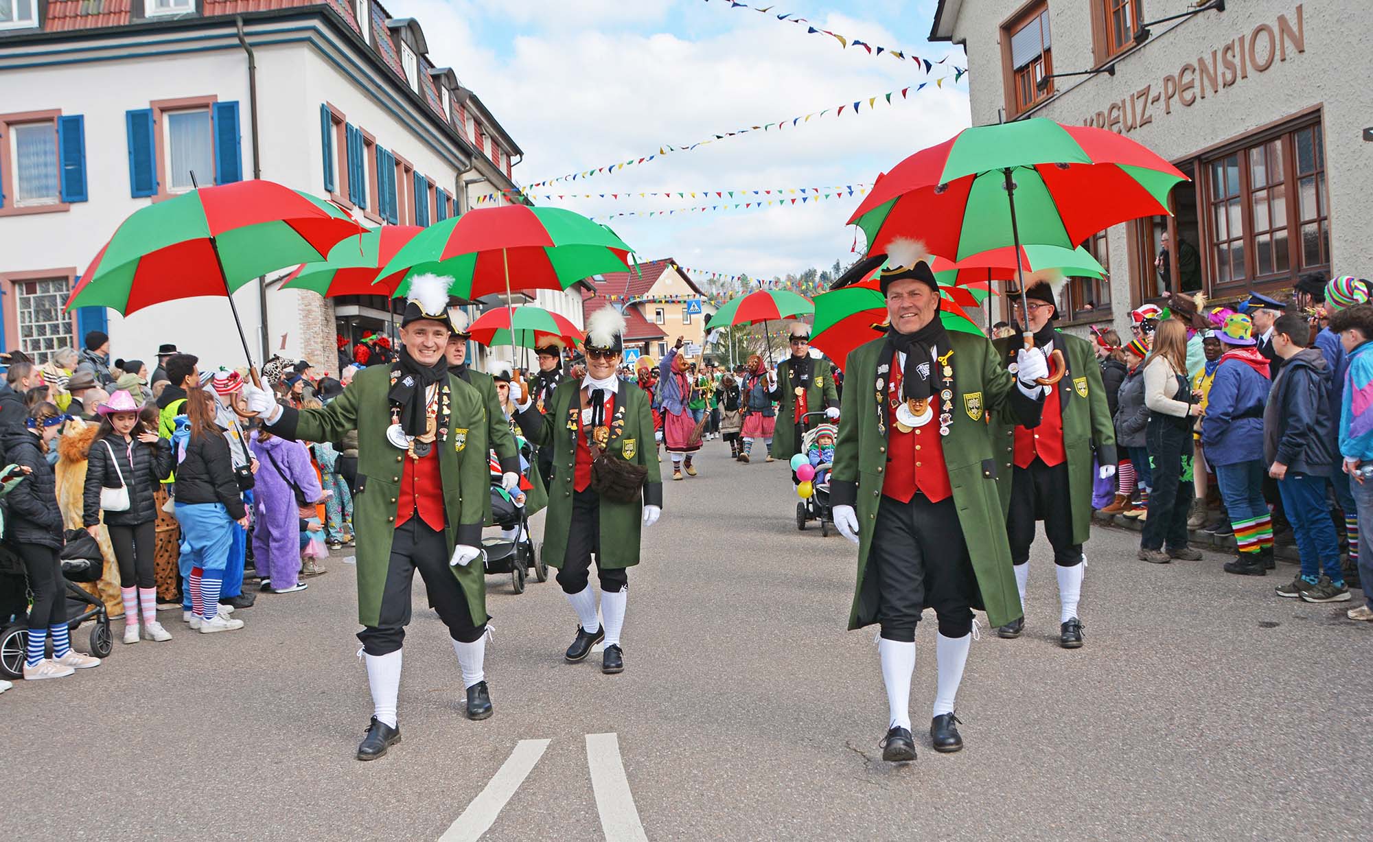 Als erste Fasendkapelle brachte das Blasorchester Biberach die Narren zum Tanzen und Schunkeln. Angeführt wurden die Musikerinnen und Musiker von „Täfelebub“ und Dirigent Axel Berger. Später im Umzug folgten unter anderem die Guggenmusiken aus Unterentersbach und Unterharmersbach sowie der Musikverein Prinzbach-Schönberg.