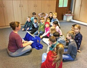 Nach dem Stöbern und Verweilen in der Bücherei lauschten die Erstklässler der Geschichte „Ein Löwe in der Bibliothek!“: Die Kinder ließen sich voll und ganz auf die Geschichte vom Löwen ein, der mit seinem Schwanz Bücherregale abstaubte. Sie halfen sehr gerne mit, um die Geschichte lebendig werden zu lassen und brüllten aus Leibeskräften wie ein Löwe oder imitierten das Winseln des traurigen Tieres.