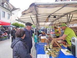 Das betraf zum einen die Kulinarik, die von bewährten Pommes mit Würstchen oder badischen Flammkuchen bis hin zu Außergewöhnlichem wie Arancina (gefüllter italienischer Reisball) und italienischer Wurst mit karamellisierter Paprika im Brot eine appetitanregende Vielfalt anbot – zum Sofortverzehr sowie zum Mitnehmen. Da durften Spezialitäten aus der Region nicht fehlen, darunter Selbstgebranntes und Selbstgebrautes. Im Rathaus gab es zudem Kaffee und eine riesige Auswahl von Kuchen und Torten, nicht wenige deckten sich hier für zu Hause ein. Am Ausgang konnte man sich dann gleich noch am Flohmarkt der katholischen Bücherei mit etwas zum Schmökern versorgen.