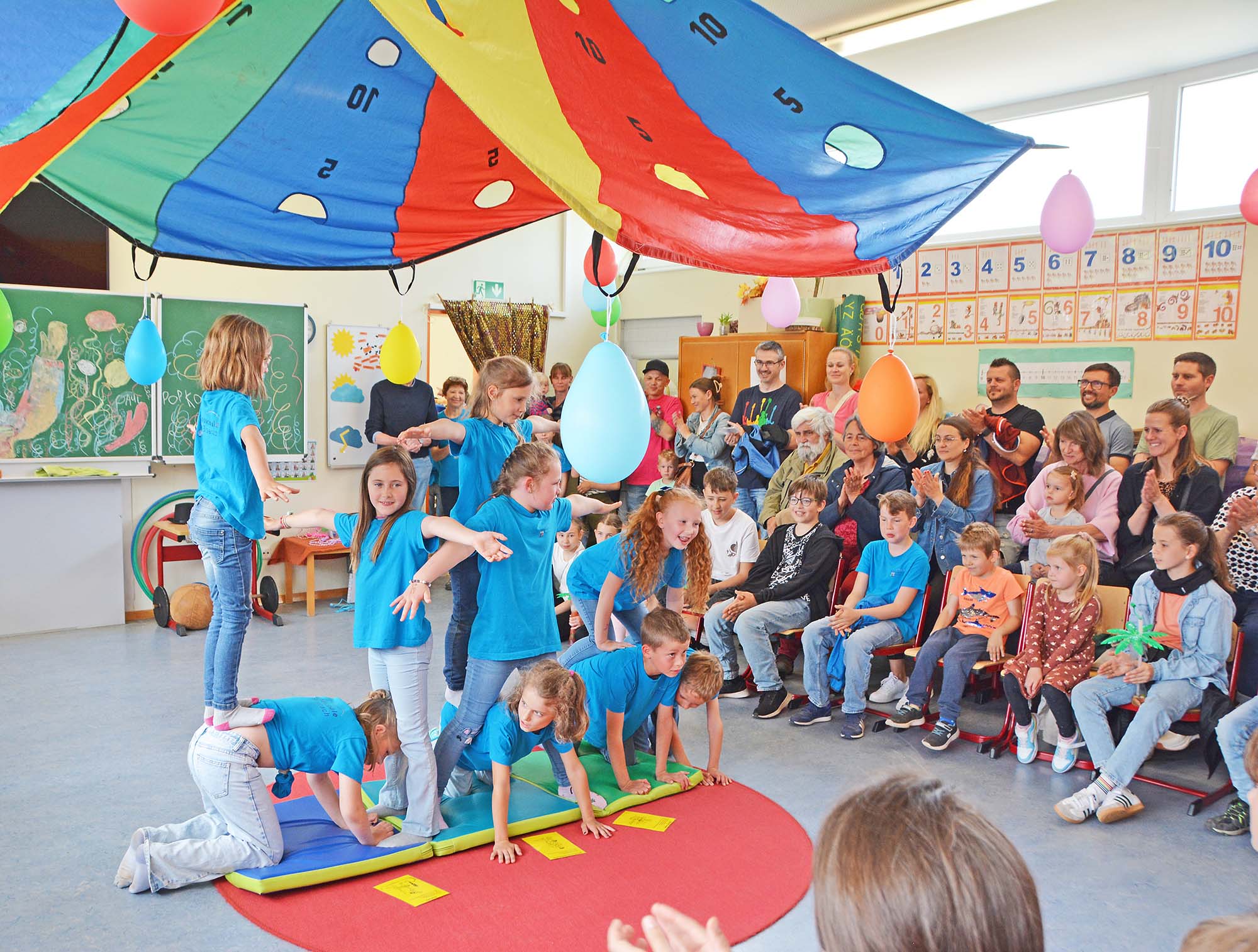 Ein besonderes Erlebnis waren die Aufführungen der Klassen 1b und 4b. Die Erstklässler zeigten im Zirkus „Popcorn“ ihr Können als Artisten, Clowns und bei einer Raubtierdressur. Die Viertklässler inszenierten das Mini-Musical „Die Bremer Stadtmusikanten“ und glänzten mit ihrer Schauspielkunst und mit musikalischem Können. Hier wie da gab es in den rappelvollen Klassenzimmern tosenden Applaus für die Schulkinder, die beim Schulfest die eigentlichen Hauptdarsteller waren.