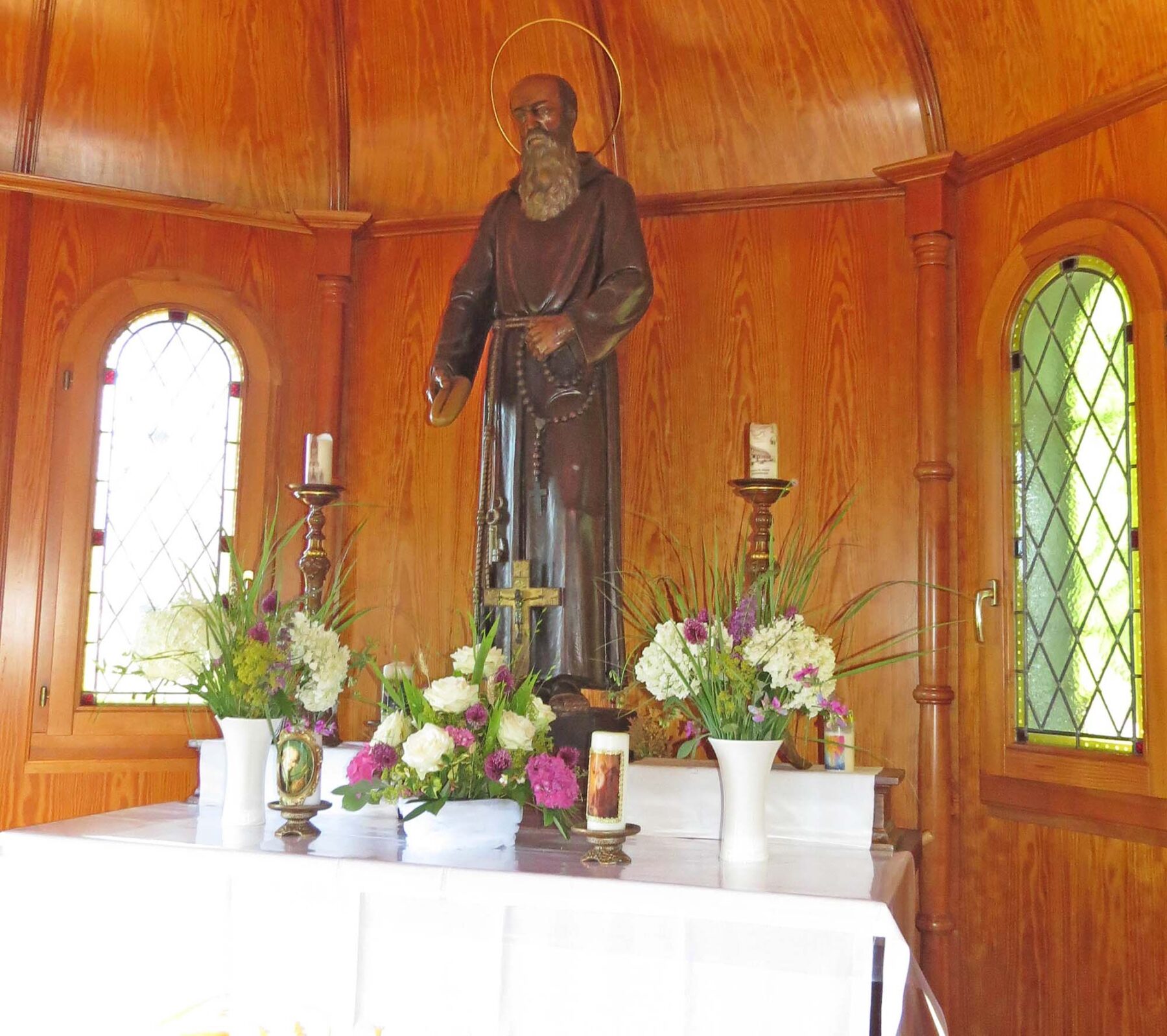 Auch Zelebrant Pater Irenäus begrüßte die Gemeinde. Er zitierte einen bekannten Spruch aus einem Brief des Heiligen Konrad, indem dieser sein großes Gottvertrauen zum Ausdruck bringt. In seiner Predigt ging er nochmals auf den Heiligen Konrad ein, den Schutzpatron der Kapelle. „Ist der Hl. Konrad für die heutige Zeit noch aktuell und was hat er uns zu sagen?“, stellte Pater Irenäus die rhetorische Frage an die Gemeinde. Bruder Konrad war Kapuziner in einem Kloster und dort an der Pforte für den Empfang der Pilger zuständig. Es waren einfache Dinge, die die Pilger von ihm erwarteten – ein Glas Wasser, ein paar wohlmeinende Worte. Bruder Konrad war „ein einfacher Mensch, der die alltäglichen Sachen mochte“, erklärte Pater Irenäus.