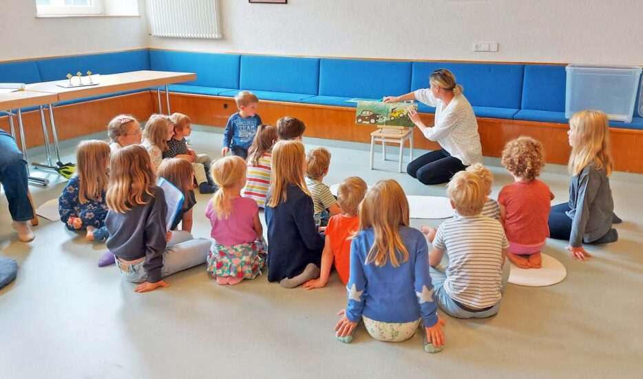 Als es darum ging lauter kleine im Raum versteckte Spielzeugautos zu suchen, gab es auch bei den Kleinsten kein Halten mehr und flugs wurden die 20 versteckten Traktoren, LKW und Feuerwehren gesucht – und gefunden! Lauter verschiedene Verkehrsteilnehmer, die alle in einer Geschichte von Janosch vorkommen: „Das Auto hier heißt Ferdinand.“ In gereimter Form wurde die Geschichte über Mut und Kraft und letzten Endes ein zu viel des Guten vorgelesen. Hier erschien der von Gott gesandte Schutzengel in Form eines weißen Pferdes. Der Schimmel rettete das Auto Ferdinand nach einem Absturz kurzerhand aus einem See. Und genau so einen Schutzengel und die Gabe den eigenen Mut und das eigene Können richtig einzuschätzen, ist der Wunsch für alle Kinder und Besucher der Kinderkirche gewesen.