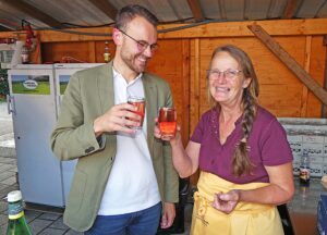 Doch nicht nur die Bewirtung will mit flinken Händen und Beinen gewuppt, sondern auch das Auge der Gäste erfreut werden. Hundert Gläser hat Rita Vitt daher mit Blumen aus dem Landgarten bestückt – für jeden Tisch ein Glas. Überall auf dem Platz gibt es zudem weitere Blumendekoration, in Körben beispielsweise. Hochaufragende Reisigbündel wiederum schmücken unter anderem die Säulen der Bühne, mit Lampionblumen umwunden.