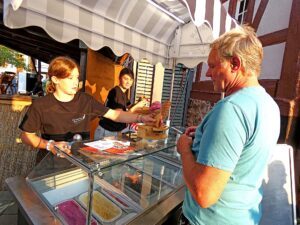 Die Speisekarte wartete unter anderem mit Wurstsalat auf, der vor Ort von im Eiltempo mischenden, kräftigen Armen frisch angemacht wurde. Das Wasser im Mund zusammenlaufen ließ auch Prinzbacher Gute-Laune-Brot mit Frischkäse vom Prinzbacher Romanhof sowie Brot mit Kräutern und essbaren bunten Blütenblättern, die allesamt aus dem riesigen Garten der andfrauenvorsitzenden Rita-Vitt stammten. Brot mit Honig von heimischen Bienen rundete die Angebotspalette ab, oder der Gästemagen entschied sich für Bauernbratwürste oder Käseknacker.