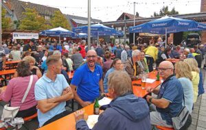 Die Klänge der Kapelle Ulli Bohnert taten ihr Übriges. Ein vielseitiges und abwechslungsreiches Programm mit Songs aus sechs Jahrzenten animierte zum Tanzen – mit Rock und Pop, Countrymusic, R&B, Beat und Schlagern. „Sich regen bringt Segen“, animierte die Band ihr Publikum zum Mitmachen. In den Musikpausen erfüllte fröhliches Stimmengewirr den Platz.