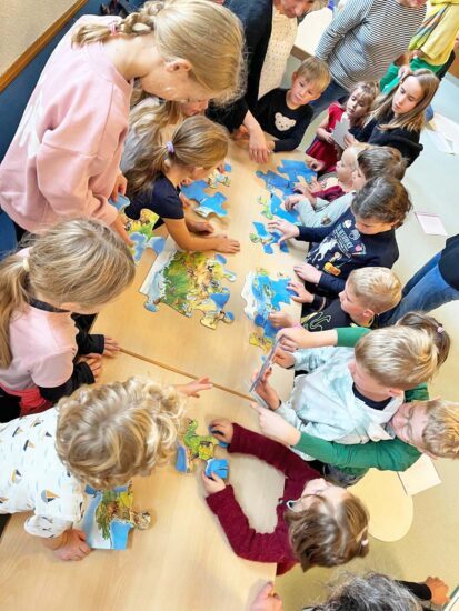 Zu Beginn sangen alle gemeinsam zu Gitarrenklängen ein Begrüßungslied, um dann im Anschluss aus bereitliegenden Puzzleteilen eine große Weltkarte zusammenzulegen. Hier konnten die Kinder Wasser und Land sowie Berge, Flüsse und Seen erkennen. Aber zu Gottes Schöpfung gehört natürlich noch mehr. Die Kinder hatten viel Spaß daran, die im Raum versteckten Tiere zu suchen. Dann wurden sie entsprechend ihrer Lebensweise dem Land oder dem Wasser zugeordnet. Hierbei kam richtig Leben in die Kinderschar!