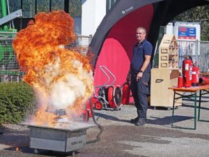 Sehr beeindruckend im Anschluss die Demonstration eines Fettbrandes, wie er in der Küche beispielsweise beim Frittieren in einem Topf oder in der Pfanne entstehen kann. Florian Möller wollte auch hier mit dem Feuerlöscher agieren. Der kleine Cedric von der Kinderfeuerwehr versucht ihn jedoch zu stoppen. „Weil, wenn man Wasser zu brennendem Fett gibt, gibt es eine Fettexplosion!“