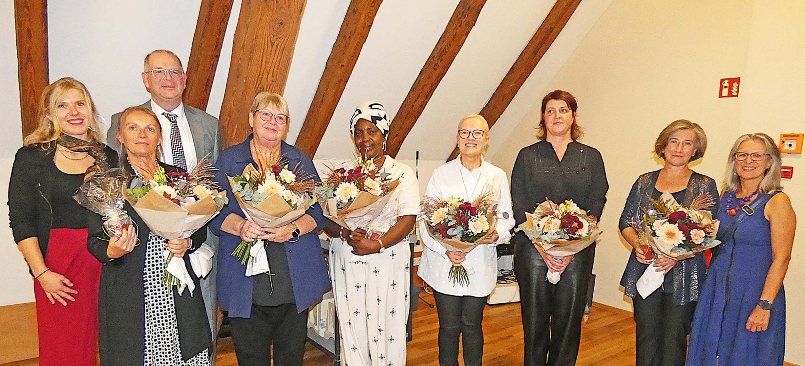 Die Einrichtungsleitenden Raphaela Jehle (rechts) und Katharina Schwarz mit Markus Harter (von links) und den für langjährige Mitarbeit in Anwesenheit Geehrten: Annett Schwendemann, Ingrid Kossack, Ruphin Himmelsbach, Marion Huber, Melanie Principato, Elja Baum. Foto: Inka Kleinke-Bialy