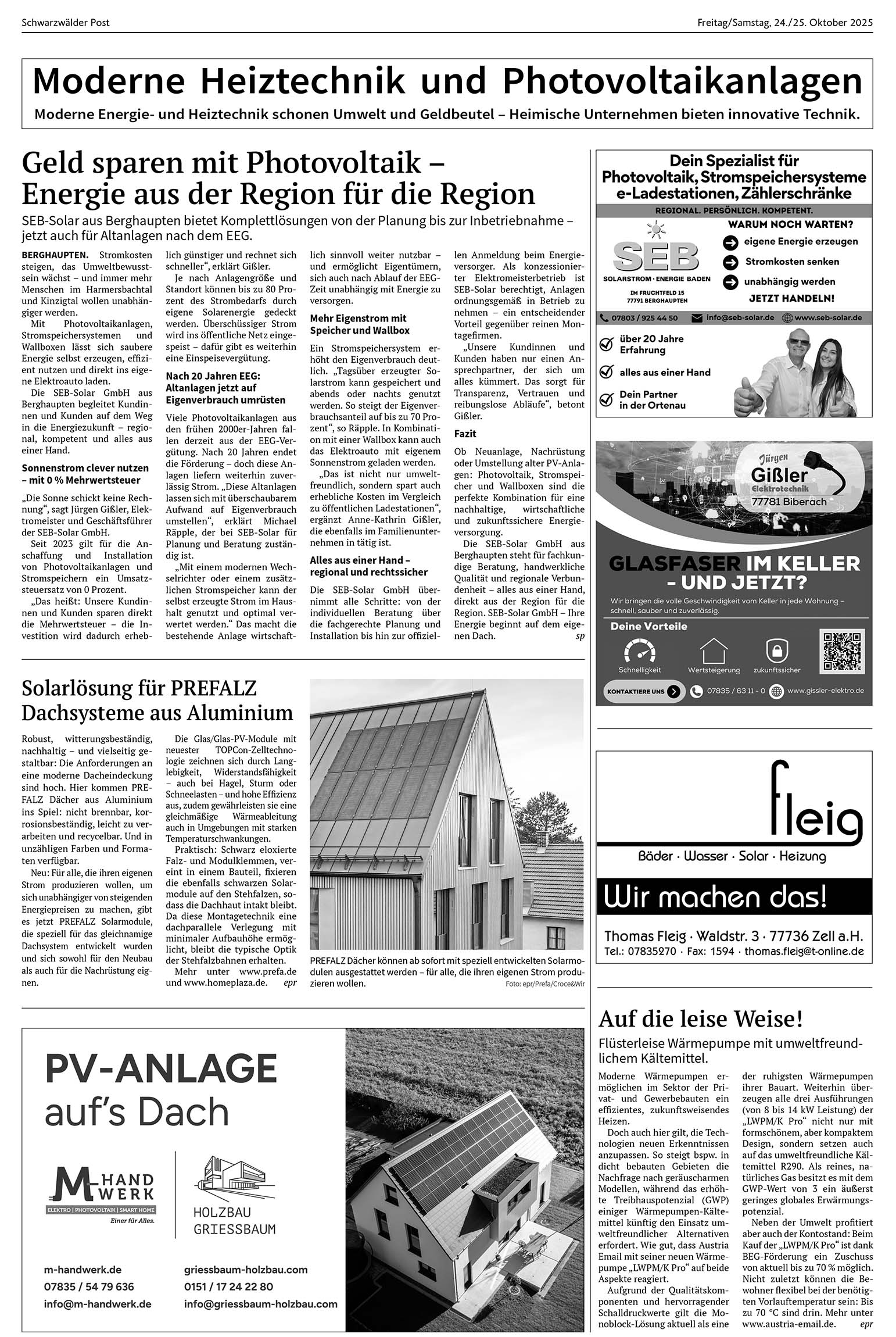 Biberach | 24.10.2025 Moderne Heiztechnik und Photovoltaikanlagen Foto:PREFALZ Dächer können ab sofort mit speziell entwickelten Solarmodulen ausgestattet werden – für alle, die ihren eigenen Strom produzieren wollen. Foto: epr/Prefa/Croce&Wir von Schwarzwälder PostModerne Energie- und Heiztechnik schonen Umwelt und Geldbeutel – Heimische Unternehmen bieten innovative Technik. Foto: SPDas könnte Sie auch interessieren:Foto: Archivfoto: Martin HuberAdventshock mit Markt in Unterentersbach…Foto: UnternehmenEin Abend voller AnerkennungFreibad: Geliebt, genutzt, defizitär