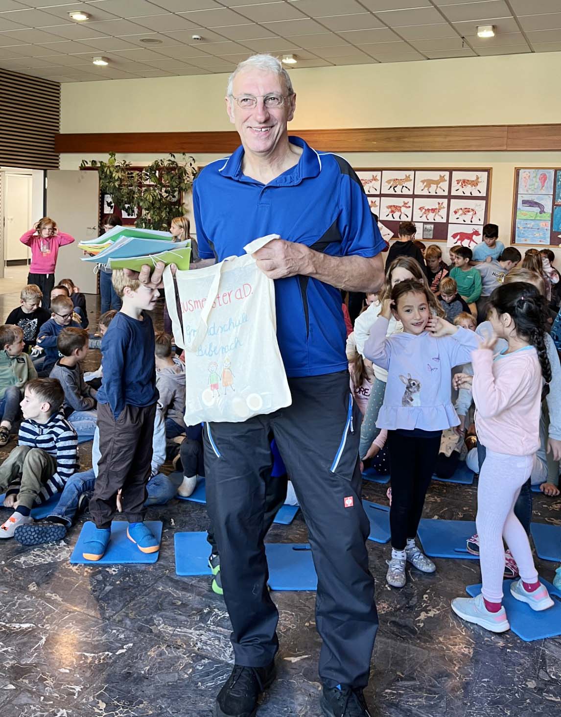 Auch die Schulkinder machten deutlich welch großer Beliebtheit sich der scheidende Hausmeister erfreut. Jede Klasse schenkte ihm ein Büchlein mit selbstgemalten Seiten zum Dank und zum Abschied. Damit er nicht mit einem leeren Säckchen nach Hause gehen musste, bekam er von jedem Kind noch einen Rententaler (aus Schokolade).
