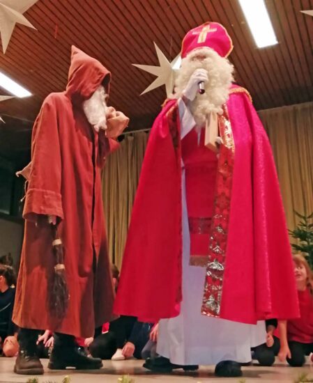 Zum Abschluss kommt der Nikolaus in die Halle. Er hört den Ständchen der Kinder zu und verteilt kleine Gaben. Das ist der Moment, auf den sich die jungen Besucher besonders freuen.