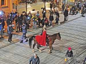 Der Höhepunkt des Abends war das St.-Martinsspiel. Neyla Paßlick stellte die Bettlerin dar, Marie Echle erzählte die Szene, und Clarissa Willmann spielte St. Martin hoch zu Ross. Gemeindereferentin Anke Haas sprach zum Abschluss ein Gebet. Dann begann der gesellige Teil. Jedes Laternenkind erhielt eine Brezel vom Gemeindeteam. Außerdem waren Punsch, Glühwein, Gebäck und Wurstwecken an den Ständen des Elternbeirats der Kita St. Barbara sehr nachgefragt.