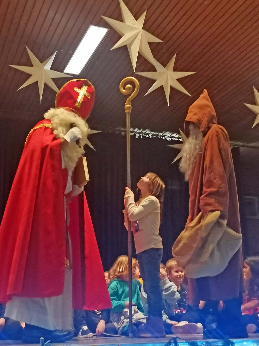 Zum Abschluss besuchten Nikolaus und Knecht Ruprecht die Turnerkinder. Sie lobten die Darbietungen und nahmen sich Zeit für die vorgetragenen Ständchen, bevor sie kleine Geschenke verteilten.